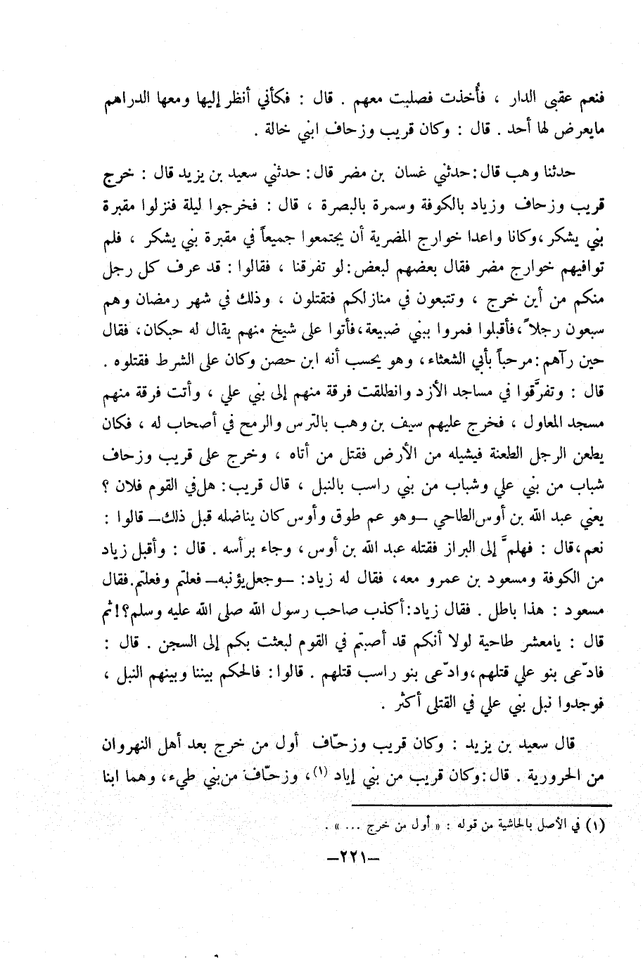 حَدَّثَنَا وهب قَالَ حَدَّثَنِي غَسَّان بْن مُضر قَالَ حَدَّثَنِي سعيد بْن يَزِيد قَالَ خرج قريب وزحاف وَزِيَاد بِالْكُوفَةِ وَسمرَة بِالْبَصْرَةِ قَالَ فَخَرجُوا لَيْلَة فنزلوا مَقْبرَة بَنِي يشْكر وَكَانَا واعدا خوارج المضرية أَن يجتمعوا جَمِيعًا فِي مَقْبرَة بَنِي يشْكر فَلم توافيهم خوارج مُضر فَقَالَ بَعضهم لبَعض لَو تفرقنا فَقَالُوا قد عرف كل رجل مِنْكُم من أَيْن خرج وتتبعون فِي مَنَازِلكُمْ فتقتلون وَذَلِكَ فِي شهر رَمَضَان وهم سَبْعُونَ رجلا فَأَقْبَلُوا فَمروا ببني ضبيعة فَأتوا عَلَى شيخ مِنْهُم يُقَال لَهُ حبكان فَقَالَ حِين رَآهُمْ مرْحَبًا بِأبي الشعْثَاء وَهُوَ يحْسب أَنه ابْن حصن وَكَانَ عَلَى الشَّرْط فَقَتَلُوهُ قَالَ وَتَفَرَّقُوا فِي مَسَاجِد الأزد وَانْطَلَقت فرقة مِنْهُم إِلَى بَنِي عَلِيّ وَأَتَتْ فرقة مِنْهُم مَسْجِد المعاول فَخرج عَلَيْهِم سيف بْن وهب بالترس وَالرمْح فِي أَصْحَاب لَهُ فَكَانَ يطعَن الرجل الطعَنة فيشيله من الأَرْض فَقتل من أَتَاهُ وَخرج عَلَى قريب وزحاف شباب من بَنِي عَلِيّ وشباب من بَنِي راسب بِالنَّبلِ قَالَ قريب هَل فِي الْقَوْم فلَان يعَني عَبْد اللَّهِ بْن أَوْس الطَّاحِي وَهُوَ عَم طوق وَأَوْس كَانَ يناضله قبل ذَلِكَ قَالُوا نعم قَالَ فَهَلُمَّ إِلَى البرَاز فَقتله عَبْد اللَّهِ بْن أَوْس وَجَاء بِرَأْسِهِ قَالَ وَأَقْبل زِيَاد من الْكُوفَة ومسعود بْن عَمْرو مَعَه فَقَالَ لَهُ زِيَاد وَجعل يؤنبه فَعلْتُمْ وفعلتم فَقَالَ مَسْعُود هَذَا بَاطِل فَقَالَ زِيَاد أكذب صَاحب رَسُول اللَّهِ صَلَّى اللَّهُ عَلَيْهِ وَسَلَّمَ ثمَّ قَالَ يَا معشر طاحية لَوْلَا أَنكُمْ قد أصبْتُم فِي الْقَوْم لبعثت بكم إِلَى السجْن قَالَ فَادّعى بَنو عَلِيّ قَتلهمْ وَادّعى بَنو راسب قَتلهمْ قَالُوا فاحكم بَيْننَا وَبينهمْ النبل فوجدوا نبل بَنِي عَلِيّ فِي الْقَتْلَى أَكثر