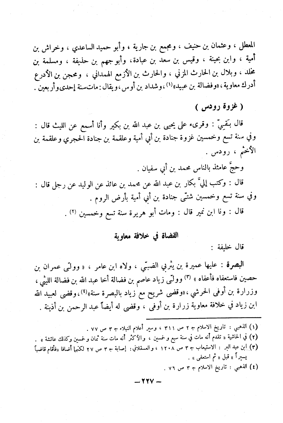 غَزْوَة رودس قَالَ بَقِي وَقُرِئَ عَلَى يحيى بْن عَبْد اللَّهِ بْن بكير وَأَنا اسْمَع عَن اللَّيْث قَالَ وَفِي سنة تسع وَخمسين غَزْوَة جُنَادَة بْن أَبِي أُميَّة وعلقمة بْن جُنَادَة الحجري وعلقمة بْن الأخثم رودس وَحج عامئذ بِالنَّاسِ مُحَمَّد بْن أَبِي سُفْيَان قَالَ وَكتب إِلَيّ بكار بْن عَبْد اللَّهِ عَن مُحَمَّد بْن عَائِذ عَن الْوَلِيد عَن رجل قَالَ وَفِي سنة تسع وَخمسين شَتَّى جُنَادَة بْن أَبِي أُميَّة بِأَرْض الرّوم قَالَ ونا ابْن نمير قَالَ وَمَات أَبُو هُرَيْرَة سنة تسع وَخمسين