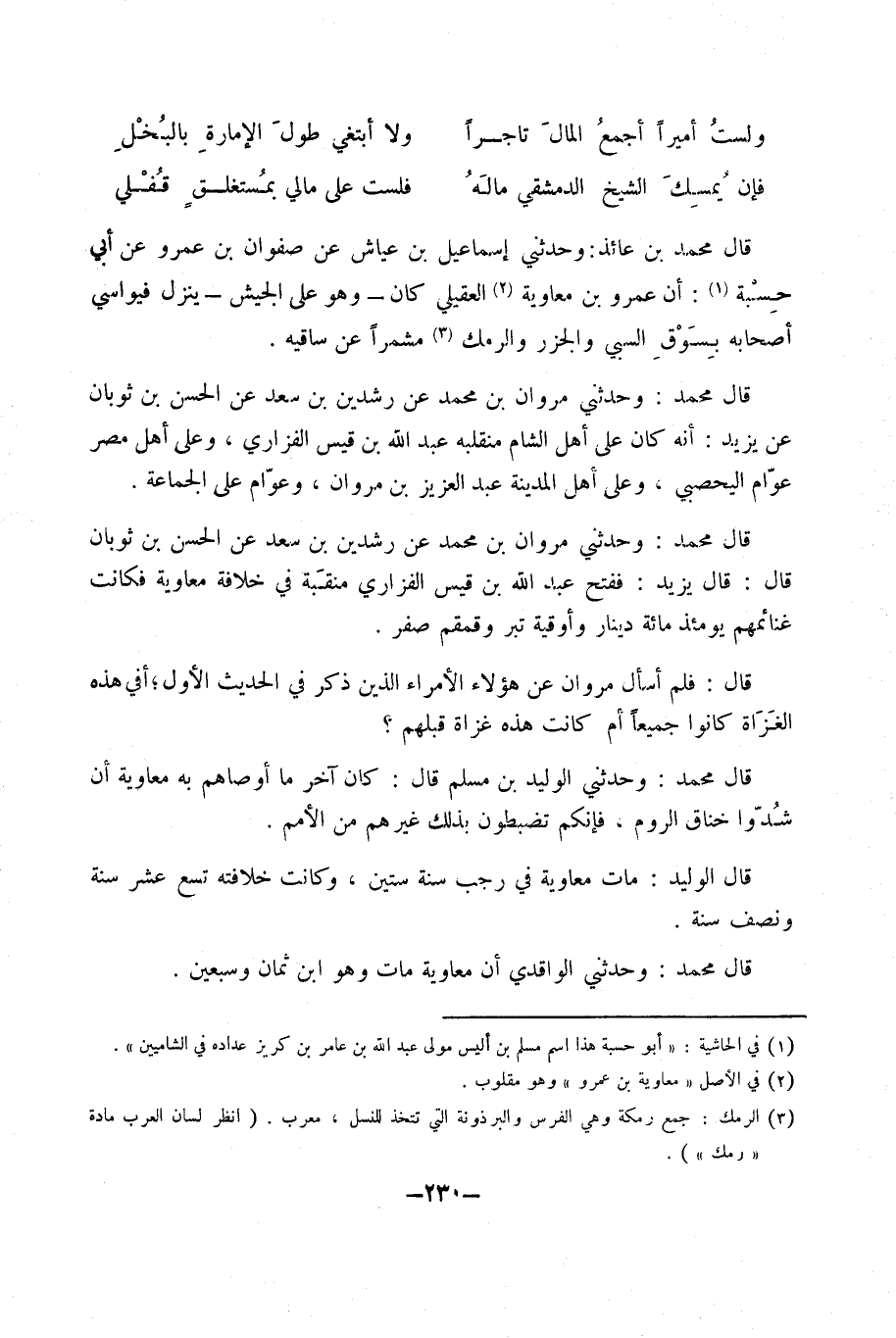 قَالَ مُحَمَّد وَحَدَّثَنِي مَرْوَان بْن مُحَمَّد عَن رشدين بْن سعد عَن الْحسن بْن ثَوْبَان عَن يَزِيد أَنه كَانَ عَلَى أهل الشَّام منقلبة عَبْد اللَّهِ بْن قيس الْفَزارِيّ وعَلى أهل مصر عوام الْيحصبِي وعَلى أهل الْمَدِينَة عَبْد الْعَزِيز بْن مَرْوَان وعوام عَلَى الْجَمَاعَة قَالَ مُحَمَّد وَحَدَّثَنِي مَرْوَان بْن مُحَمَّد عَن رشدين بْن سعد عَن الْحسن بْن ثَوْبَان قَالَ قَالَ يَزِيد فَفتح عَبْد اللَّهِ بْن قيس الْفَزارِيّ منقبة فِي خلَافَة مُعَاوِيَة فَكَانَت غنائمهم يَوْمئِذٍ مائَة دِينَار وأوقية تبر وقمقم صفر قَالَ فَلم أسأَل مَرْوَان عَن هَؤُلَاءِ الْأُمَرَاء الَّذين ذكر فِي الحَدِيث الأول أَفِي هَذِهِ الْغُزَاة كَانُوا جَمِيعًا أم كَانَت هَذِهِ غزَاة قبلهم قَالَ مُحَمَّد وَحَدَّثَنِي الْوَلِيد بْن مُسلم قَالَ كَانَ آخر مَا أوصاهم بِهِ مُعَاوِيَة أَن شدوا خناق الرّوم فَإِنَّكُم تضبطون بذلك غَيرهم من الْأُمَم قَالَ الْوَلِيد مَاتَ مُعَاوِيَة فِي رَجَب سنة سِتِّينَ وَكَانَت خِلَافَته تسع عشر سنة وَنصف سنة قَالَ مُحَمَّد وَحَدَّثَنِي الْوَاقِدِيّ أَن مُعَاوِيَة مَاتَ وَهُوَ ابْن ثَمَان وَسبعين