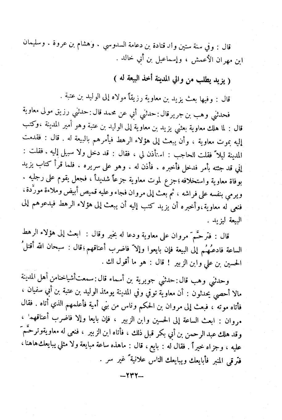 فَحَدثني وهب بْن جرير قَالَ حَدَّثَنِي أَبِي عَن مُحَمَّد قَالَ حَدَّثَنِي رُزَيْق مولى مُعَاوِيَة قَالَ لما هلك مُعَاوِيَة بَعَثَنِي يَزِيد بْن مُعَاوِيَة إِلَى الْوَلِيد بْن عتبَة وَهُوَ أَمِير الْمَدِينَة وَكتب إِلَيْهِ بِمَوْت مُعَاوِيَة وَأَن يبْعَث إِلَى هَؤُلَاءِ الرَّهْط فيأمرهم بالبيعة لَهُ قَالَ فَقدمت الْمَدِينَة لَيْلًا فَقلت للحاجب اسْتَأْذن لي فَقَالَ قد دخل وَلَا سَبِيل إِلَيْهِ فَقلت إِنِّي قد جِئْته بِأَمْر فَدخل فَأخْبرهُ فَأذن لَهُ وَهُوَ عَلَى سَرِيره فَلَمَّا قَرَأَ كتاب يَزِيد بوفاة مُعَاوِيَة واستخلافه جزع لمَوْت مُعَاوِيَة جزعا شَدِيدا فَجعل يقوم عَلَى رجلَيْهِ وَيَرْمِي بِنَفسِهِ عَلَى فرَاشه ثمَّ بعث إِلَى مَرْوَان فجَاء وَعَلِيهِ قَمِيص أَبيض وملاءة موردة فنعى لَهُ مُعَاوِيَة وَأخْبرهُ أَن يَزِيد كتب إِلَيْهِ أَن يبْعَث إِلَى هَؤُلَاءِ الرَّهْط فيدعوهم إِلَى الْبيعَة ليزِيد