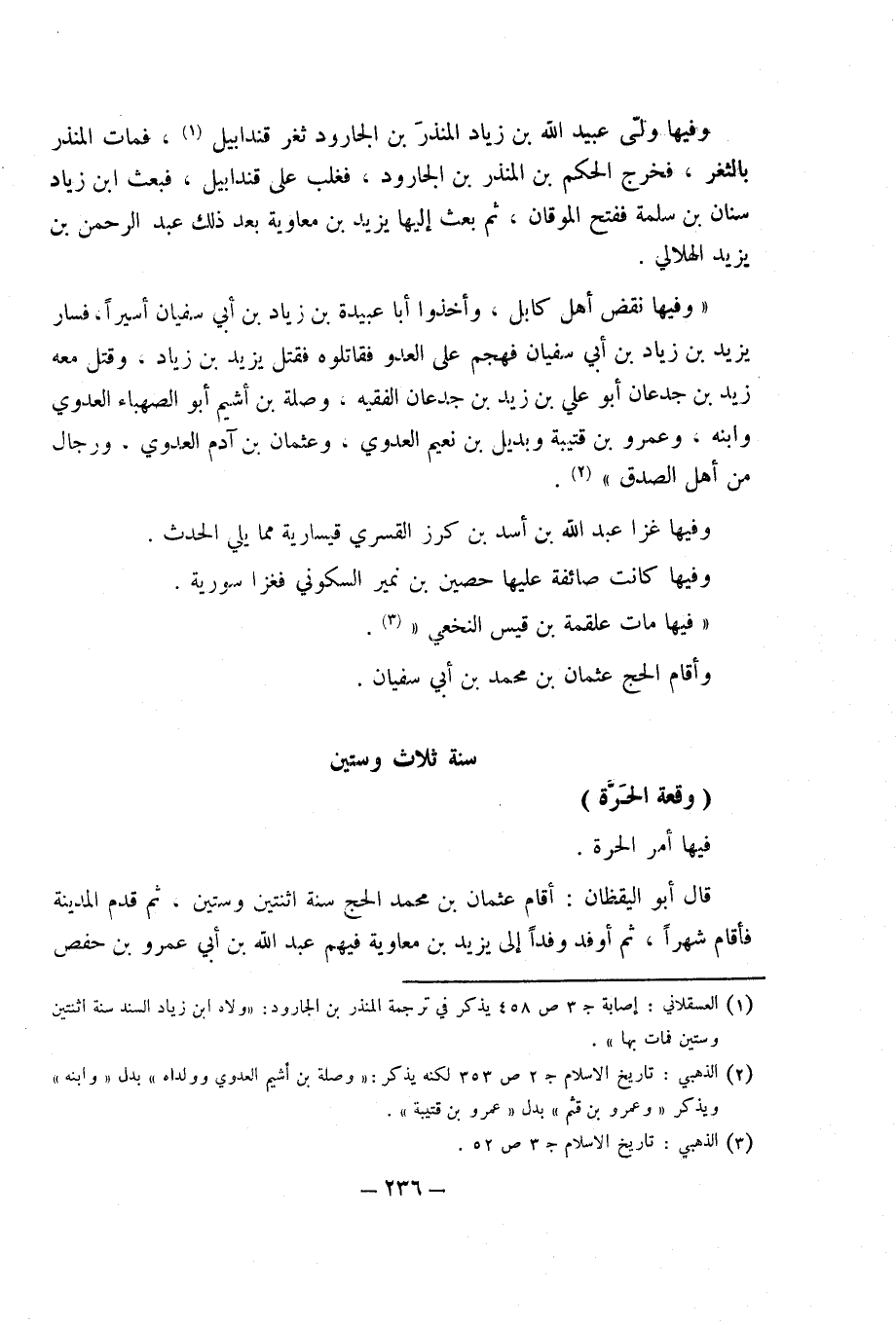 سنة ثَلَاث وَسِتِّينَ وقْعَة الْحرَّة فِيهَا أَمر الْحرَّة قَالَ أَبُو الْيَقظَان أَقَامَ عُثْمَان بْن مُحَمَّد الْحَج سنة اثْنَتَيْنِ وَسِتِّينَ ثمَّ قدم الْمَدِينَة فَأَقَامَ شهرا ثمَّ أوفد وَفْدًا إِلَى يَزِيد بْن مُعَاوِيَة فيهم عَبْد اللَّهِ بْن أَبِي عَمْرو بن حَفْص