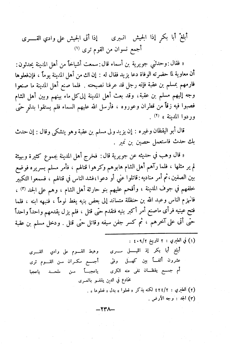 قَالَ وهب فِي حَدِيثه عَن جوَيْرِية قَالَ فَخرج أهل الْمَدِينَة بجموع كَثِيرَة وبهيئة لم ير مثلهَا فَلَمَّا رَآهُمْ أهل الشَّام هابوهم وكرهوا قِتَالهمْ فَأمر مُسلم بسريره فَوضع بَين الصفين ثمَّ أَمر مناديه قَاتلُوا عَني أَو دعوا فَشد النَّاس فِي قِتَالهمْ فَسَمِعُوا التَّكْبِير خَلفهم فِي جَوف الْمَدِينَة وأقحم عَلَيْهِم بَنو حَارِثَة أهل الشَّام وهم عَلَى الْجد فَانْهَزَمَ النَّاس وَعبد اللَّه بْن حَنْظَلَة متساند إِلَى بعض بنيه يغط نوما فَنَبَّهَهُ ابْنه فَلَمَّا فتح عَيْنَيْهِ فَرَأى مَا صنع أَمر أكبر بنيه فَتقدم حَتَّى قتل فَلم يزل يقدمهم وَاحِدًا احدا حَتَّى أَتَى عَلَى آخِرهم ثمَّ كسر جفن سَيْفه وَقَاتل حَتَّى قتل وَدخل مُسلم بْن عقبَة