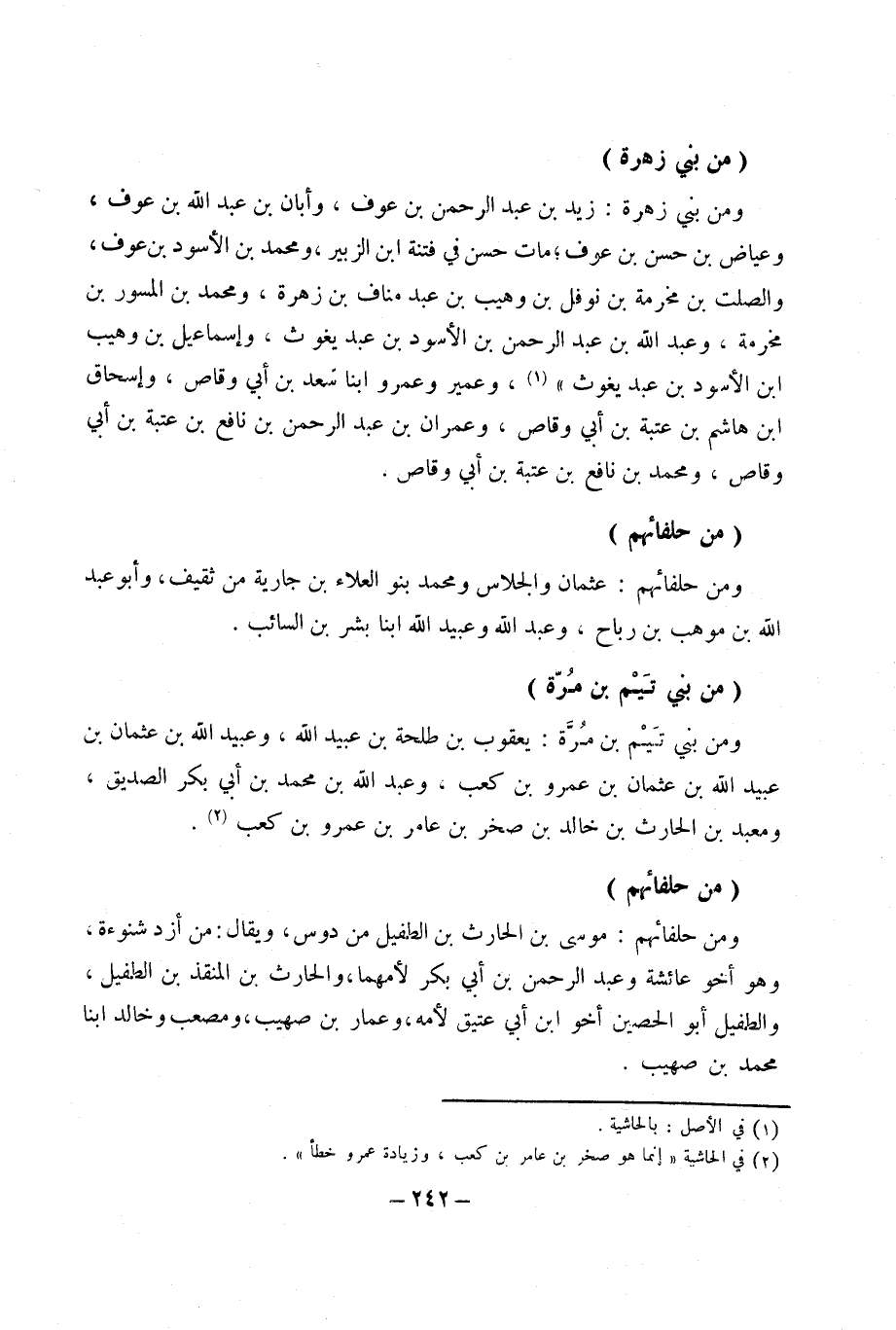 وَمن بَنِي زهرَة زيد بْن عَبْد الرَّحْمَن بْن عَوْف وَأَبَان بْن عَبْد اللَّهِ بْن عَوْف وعياض بْن حسن بْن عَوْف مَاتَ حسن فِي فتْنَة ابْن الزبير وَمُحَمّد بْن الْأسود بْن عَوْف والصلت بْن مخرمَة بْن نَوْفَل بْن وهيب بْن عَبْد منَاف بْن زهرَة وَمُحَمّد بْن المصور بْن الْمسور بْن مخرمَة وَعبد الله بْن عَبْد الرَّحْمَن بْن الْأسود بْن عَبْد يَغُوث وَإِسْمَاعِيل بْن وهيب ابْن الْأسود بْن عَبْد يَغُوث وَعُمَيْر وَعَمْرو ابْنا سعد بْن أَبِي وَقاص وَإِسْحَاق ابْن هَاشم بْن عتبَة بْن أَبِي وَقاص وَعمْرَان بْن عَبْد الرَّحْمَن بْن نَافِع بْن عتبَة بْن أَبِي وَقاص وَمُحَمّد بْن نَافِع بْن عتبَة بْن أَبِي وَقاص