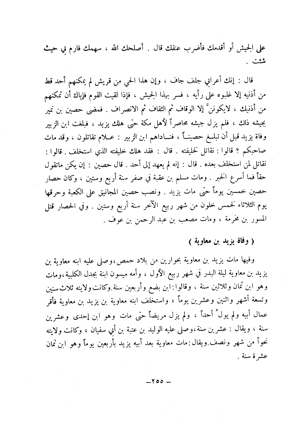 عَلَى الْجَيْش أَو أقدمك فَاضْرب عَنقك قَالَ أصلحك اللَّه سهمك فارم بِي حَيْثُ شِئْت قَالَ إِنَّك أَعْرَابِي جلف جَاف وَإِن هَذَا الْحَيّ من قُرَيْش لم يُمكنهُم أحد قطّ من أُذُنَيْهِ إِلَّا غلبوه عَلَى رَأْيه فسر بِهَذَا الْجَيْش فَإِذا لقِيت الْقَوْم فإياك أَن تمكنهم من أذنيك لَا يكونن إِلَّا الوقاف ثمَّ الثِّقَات ثمَّ الإنصراف فَمضى حُصَيْن بْن نمير بجيشه ذَلِكَ فَلم يزل جَيْشه محاصرا لأهل مَكَّة حَتَّى هلك يَزِيد فبلغت ابْن الزبير وَفَاة يَزِيد قبل أَن تبلغ حصينا فناداهم ابْن الزبير علام تقاتلون وَقد مَاتَ صَاحبكُم قَالُوا نُقَاتِل لخليفته قَالَ فقد هلك خَلِيفَته الَّذِي اسْتخْلف قَالُوا نُقَاتِل لمن اسْتخْلف بعده قَالَ إِنَّه لم يعْهَد إِلَى أحد قَالَ حُصَيْن إِن يكن مَا تَقول حَقًا فَمَا أسْرع الْخَبَر وَمَات مُسلم بْن عقبَة فِي صفر سنة أَربع وَسِتِّينَ وَكَانَ حِصَار حُصَيْن خمسين يَوْمًا حَتَّى مَاتَ يَزِيد وَنصب حُصَيْن المجانيق عَلَى الْكَعْبَة وحرقها يَوْم الثُّلَاثَاء لخمس خَلَوْنَ مِنْ شَهْرِ رَبِيعٍ الآخَرِ سنة أَربع وَسِتِّينَ وَفِي الْحصار قتل الْمسور بْن مخرمَة وَمَات مُصْعَبِ بْنِ عَبْدِ الرَّحْمَنِ بْنِ عَوْف