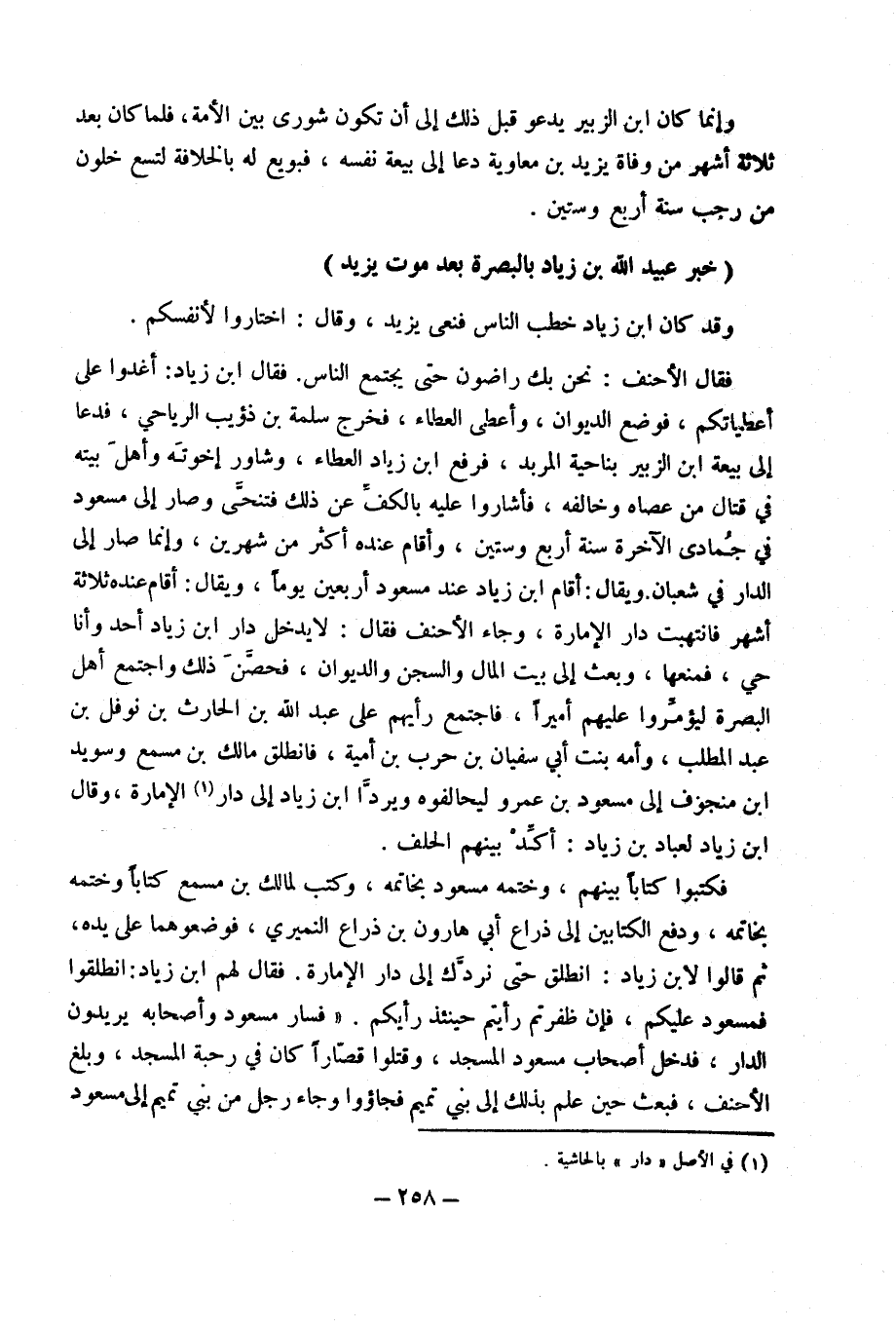 فَقَالَ الْأَحْنَف نَحن بك راضون حَتَّى يجْتَمع النَّاس فَقَالَ ابْن زِيَاد أغدوا عَلَى أعطياتكم فَوضع الدِّيوَان وَأعْطى الْعَطاء فَخرج سَلمَة بْن ذُؤَيْب الريَاحي فَدَعَا إِلَى بيعَة ابْن الزبير بِنَاحِيَة المربد فَرفع ابْن زِيَاد الْعَطاء وشاور إخْوَته وَأهل بَيته فِي قتال من عَصَاهُ وَخَالفهُ فأشاروا عَلَيْهِ بالكف عَن ذَلِكَ فَتنحّى وَصَارَ إِلَى مَسْعُود فِي جُمَادَى الْآخِرَة سنة أَربع وَسِتِّينَ وَأقَام عَنده أَكثر من شَهْرَيْن وَإِنَّمَا صَار إِلَى الدَّار فِي شعْبَان وَيُقَال أَقَامَ ابْن زِيَاد عَند مَسْعُود أَرْبَعِينَ يَوْمًا وَيُقَال أَقَامَ عِنْده ثَلَاثَة أشهر فانتهبهت دَار الْإِمَارَة وَجَاء الْأَحْنَف فَقَالَ لَا يدْخل دَار ابْن زِيَاد أحد وَأَنا حَيّ فَمنعهَا وَبعث إِلَى بَيت المَال والسجن والديوان فحصن ذَلِكَ وَاجْتمعَ أهل الْبَصْرَة ليؤمروا عَلَيْهِم أَمِيرا فَاجْتمع رَأْيهمْ عَلَى عَبْد اللَّهِ بْن الْحَارِث بْن نَوْفَل بْن عَبْد الْمطلب وَأمه بنت أَبِي سُفْيَان بْن حَرْب بْن أُميَّة فَانْطَلق مَالك بْن مسمع وسُويد ابْن منجوف إِلَى مَسْعُود بْن عَمْرو ليحالفوه ويردوا ابْن زِيَاد إِلَى دَار الْإِمَارَة وَقَالَ ابْن زِيَاد لعباد بْن زِيَاد أكد بَينهم الْحلف
