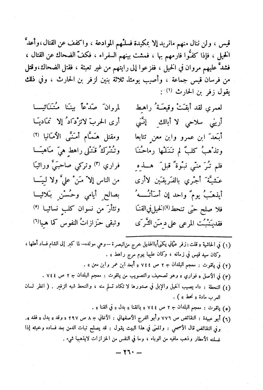 قيس وَلنْ ننال مِنْهُم مَا نُرِيد إِلَّا بمكيدة فسلهم الْمُوَادَعَة واكفف عَن الْقِتَال وَأعد الْخَيل فَإِذا كفوا فَارْمِهِمْ بهَا فمشت بَينهم السفراء فَكف الضَّحَّاك عَن الْقِتَال فَشد عَلَيْهِم مَرْوَان فِي الْخَيل ففزعوا إِلَى رايتهم من غير تعبئة فَقتل الضَّحَّاك وَقتل من فرسَان قيس جمَاعَة وَأُصِيب يَوْمئِذٍ ثَلَاثَة بَنِينَ لزفَر بْن الْحَارِث وَفِي ذَلِكَ يَقُول زفر بن الْحَارِث ... لعمري لقد أبقت وقيعة راهط لمروان صدعا بَيْننَا متنائيا ...