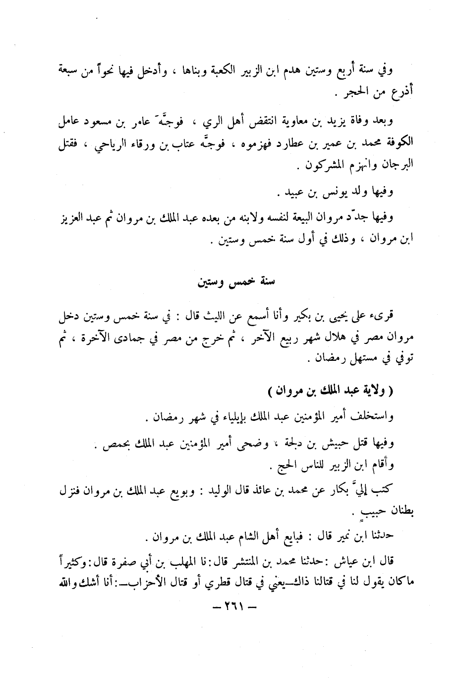 ولَايَة عَبْد الْملك بْن مَرْوَان واستخلف أَمِير الْمُؤمنِينَ عَبْد الْملك بإيلياء فِي شهر رَمَضَان وفيهَا قتل حُبَيْش بْن دلجة وضحى أَمِير الْمُؤمنِينَ عَبْد الْملك بحمص وَأقَام ابْن الزبير للنَّاس الْحَج كتب إِلَيّ بكار عَن مُحَمَّد بْن عَائِذ قَالَ الْوَلِيد وبويع عَبْد الْملك بْن مَرْوَان فَنزل بطْنَان حبيب حَدَّثَنَا ابْن نمير قَالَ فَبَايع أهل الشَّام عَبْدَ الْمَلِكِ بْنَ مَرْوَانَ قَالَ ابْن عَيَّاش حَدَّثَنَا مُحَمَّد بْن الْمُنْتَشِر قَالَ نَا الْمُهلب بْن أَبِي صفرَة قَالَ وَكَثِيرًا مَا كَانَ يَقُول لنا فِي قتالنا ذَاك يعَني فِي قتال قطري أَو قتال الْأَحْزَاب أَنا أَشك وَالله