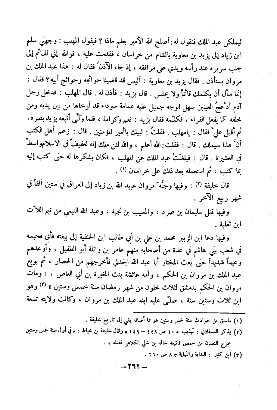 ليملكن عَبْد الْملك فَنَقُول لَهُ أصلح اللَّه الْأَمِير بِعلم مَاذَا فَيَقُول الْمُهلب وجهني سلم ابْن زِيَاد إِلَى يَزِيد بْن مُعَاوِيَة بِالشَّام من خُرَاسَان فَقدمت عَلَيْهِ فوَاللَّه إِنِّي لقائم إِلَى جنب سَرِيره عَند رَأسه ويدي عَلَى مرافقه إِذْ جَاءَ الْآذِن فَقَالَ لَهُ هَذَا عَبْد الْملك بْن مَرْوَان يسْتَأْذن فَقَالَ يَزِيد بْن مُعَاوِيَة أَلَيْسَ قد قضينا حَوَائِجه أَبِيه فَقَالَ إِنَّمَا سَأَلَ أَن يكلمك قَائِما وَلَا يجلس قَالَ يَزِيد فَأذن لَهُ قَالَ الْمُهلب فَدخل رجل آدم أدعج الْعَينَيْنِ سهل الْوَجْه جميل عَلَيْهِ عِمَامَة سَوْدَاء قد أرخاها من بَين يَدَيْهِ وَمن خَلفه كَمَا يفعل الْقُرَّاء فَكَلمهُ فَقَالَ يَزِيد نعم وكرامة فَلَمَّا ولى أتبعه يَزِيد بَصَره ثمَّ أقبل عَلِيّ فَقَالَ يَا مهلب فَقلت لبيْك يَا أَمِير الْمُؤمنِينَ قَالَ زعم أهل الْكتب أَن هَذَا سيملك قَالَ فَقلت اللَّه أعلم وَالله لَئِن ملك إِنَّه لعفيف فِي الأسلام وَاسِط فِي الْعَشِيرَة قَالَ فبلغت عَبْد الْملك عَن الْمُهلب فَكَانَ يشكرها لَهُ حَتَّى كتب إِلَيْهِ بِمَا كتب ثمَّ اسْتَعْملهُ بعد ذَلِك على خُرَاسَان