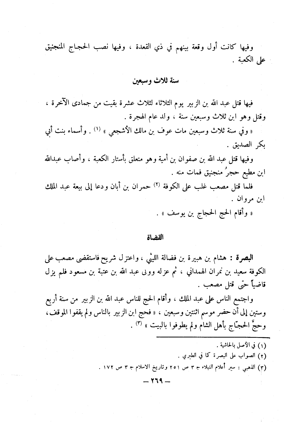 فِيهَا قتل عَبْد اللَّهِ بْن الزبير يَوْم الثُّلَاثَاء لثلاث عشرَة بقيت من جُمَادَى الْآخِرَة وَقتل وَهُوَ ابْن ثَلَاث وَسبعين سنة ولد عَام الْهِجْرَة وَفِي سنة ثَلَاث وَسبعين مَاتَ عَوْف بْن مَالك الْأَشْجَعِيّ وَأَسْمَاء بنت أَبِي بَكْر الصّديق وَفِيه قتل عَبْد اللَّهِ بن صَفْوَان بن أُميَّة وَهُوَ مُتَعَلق بِأَسْتَارِ الْكَعْبَة وَأصَاب عَبْد اللَّهِ ابْن مُطِيع حجر منجنيق فَمَاتَ مِنْهُ فَلَمَّا قتل مُصعب غلب عَلَى الْكُوفَة حمْرَان بْن أبان ودعا إِلَى بيعَة عَبْد الْملك ابْن مَرْوَان وَأقَام الْحَج الْحجَّاج بْن يُوسُف