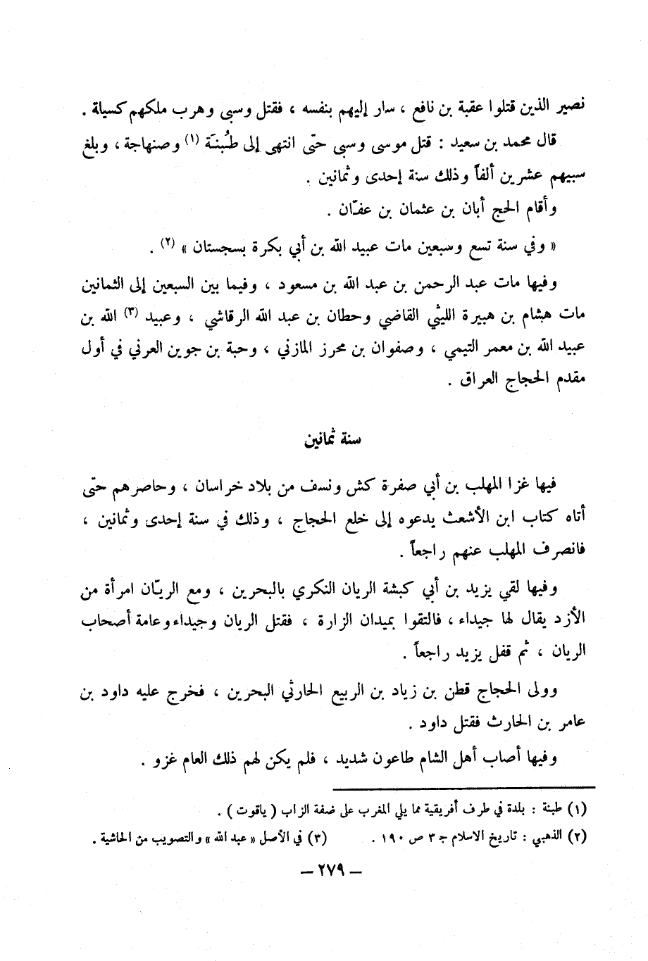 نصير الَّذين قتلوا عقبَة بْن نَافِع سَار إِلَيْهِم بِنَفسِهِ فَقتل وسبى وهرب ملكهم كسيلة قَالَ مُحَمَّد بْن سعيد قتل مُوسَى وسبى حَتَّى انْتهى إِلَى طبنة وصنهاجة وَبلغ سَبْيهمْ عشْرين ألفا وَذَلِكَ سنة إِحْدَى وَثَمَانِينَ وَأقَام الْحَج أبان بْن عُثْمَان بْن عَفَّان وَفِي سنة تسع وَسبعين مَاتَ عبيد اللَّه بْن أَبِي بكرَة بسجستان وفيهَا مَاتَ عَبْد الرَّحْمَن بْن عَبْد اللَّهِ بْن مَسْعُود وَفِيمَا بَين السّبْعين إِلَى الثَّمَانِينَ مَاتَ هِشَام بْن هُبَيْرَة اللَّيْثِيّ القَاضِي وحطان بْن عَبْد اللَّهِ الرقاشِي وَعبيد اللَّه بْن عبيد اللَّه بْن معمر التَّيْمِيّ وَصَفوَان بْن مُحرز الْمَازِني وحبة بْن جُوَيْن العرني فِي أول مقدم الْحجَّاج الْعرَاق