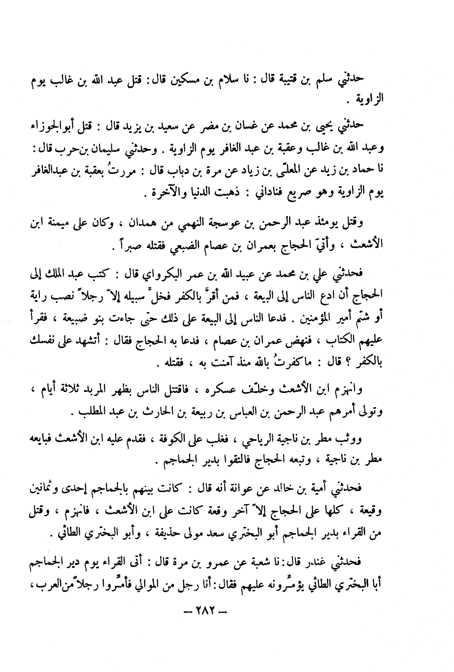 فَحَدثني أُميَّة بْن خَالِد عَن عوَانَة أَنه قَالَ كَانَت بَينهم بالجماجم إِحْدَى وَثَمَانِينَ وقيعة كلهَا عَلَى الْحجَّاج إِلَّا آخر وقْعَة كَانَت عَلَى ابْن الْأَشْعَث فَانْهَزَمَ وَقتل من الْقُرَّاء بدير الجماجم أَبُو البخْترِي سعد مولى حُذَيْفَة وَأَبُو البخْترِي الطَّائِي