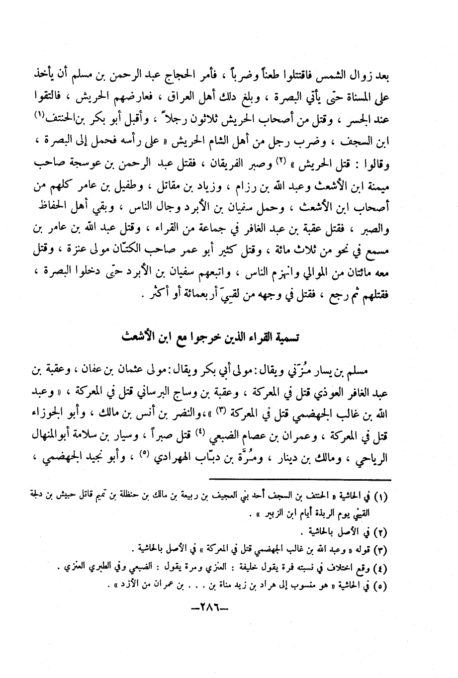 بعد زَوَال الشَّمْس فَاقْتَتلُوا طعَنا وَضَربا فَأمر الْحجَّاج عَبْد الرَّحْمَن بْن مُسلم أَن يَأْخُذ عَلَى المسناة حَتَّى يَأْتِي الْبَصْرَة وَبلغ ذَلِكَ أهل الْعرَاق فعارضهم الْحَرِيش فَالْتَقوا عَند الجسر وَقتل من أَصْحَاب الْحَرِيش ثَلَاثُونَ رجلا وَأَقْبل أَبُو بَكْر بْن الحنتف ابْن السجف وَضرب رجل من أهل الشَّام الْحَرِيش عَلَى رَأسه فَحمل إِلَى الْبَصْرَة وَقَالُوا قتل الْحَرِيش وصبر الْفَرِيقَانِ فَقتل عَبْد الرَّحْمَن بْن عَوْسَجَة صَاحب ميمنة ابْن الْأَشْعَث وَعبد اللَّه بْن رزام وَزِيَاد بْن مقَاتل وطفيل بْن عَامر كلهم من أَصْحَاب ابْن الْأَشْعَث وَحمل سُفْيَان بْن الْأَبْرَد وجال النَّاس وَبَقِي أهل الْحفاظ وَالصَّبْر فَقتل عقبَة بْن عَبْد الغافر فِي جمَاعَة من الْقُرَّاء وَقتل عَبْد اللَّهِ بْن عَامر بْن مسمع فِي نَحْو من ثَلَاث مائَة وَقتل كثير أَبُو عُمَر صَاحب الْكَتَّان مولى عَنزة وَقتل مَعَه مِائَتَان من الموَالِي وَانْهَزَمَ النَّاس واتبعهم سُفْيَان بْن الْأَبْرَد حَتَّى دخلُوا الْبَصْرَة فَقَتلهُمْ ثمَّ رَجَعَ فَقتل فِي وَجهه من لَقِي أَرْبَعمِائَة أَو أَكثر