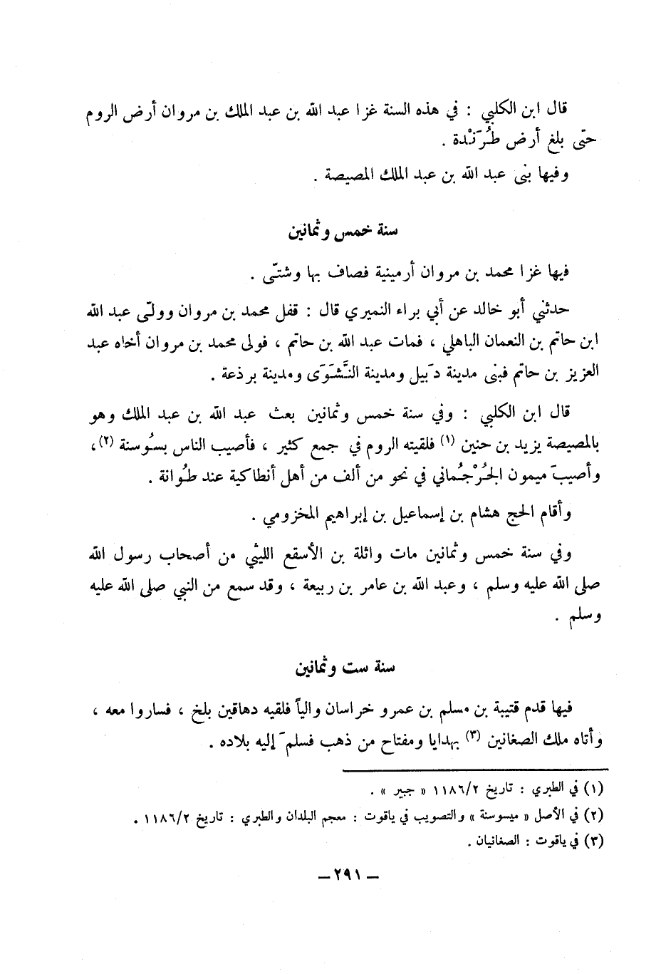 قَالَ ابْن الْكَلْبِيّ فِي هَذِهِ السّنة غزا عَبْد اللَّهِ بْن عبد الْملك بْن مَرْوَان أَرض الرّوم حَتَّى بلغ أَرض طرندة وفيهَا بنى عَبْد الْملك بْن عَبْد الْملك المصيصة