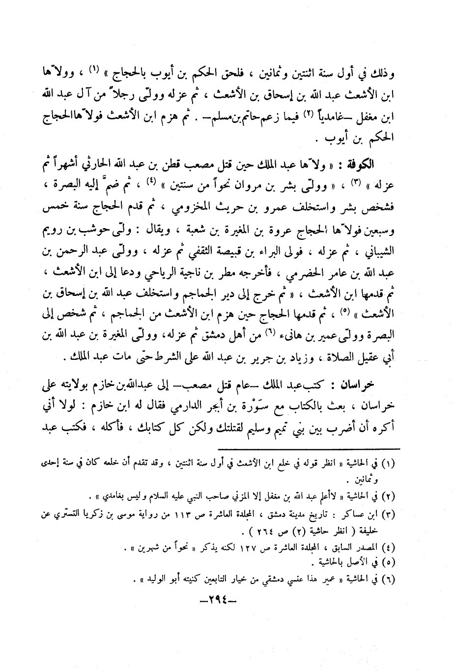 وَذَلِكَ فِي أول سنة اثْنَتَيْنِ وَثَمَانِينَ فلحق الحكم بْن أَيُّوب بالحجاج وولاها ابْن الْأَشْعَث عَبْد اللَّهِ بْن إِسْحَاق بْن الْأَشْعَث ثمَّ عَزله وَولى رجلا من آل عَبْد اللَّهِ ابْن مُغفل غامديا فِيمَا زعم حَاتِم بْن مُسلم ثمَّ هزم ابْن الْأَشْعَث فولاها الْحجَّاج الحكم بْن أَيُّوب الْكُوفَة ولاها عَبْد الْملك حِين قتل مُصعب قطن بْن عَبْد اللَّهِ الْحَارِثِيّ أشهرا ثمَّ عَزله وَولى بشر بْن مَرْوَان نَحوا من سنتَيْن ثمَّ ضم إِلَيْهِ الْبَصْرَة فشخص بشر واستخلف عَمْرو بْن حُرَيْث المَخْزُومِي ثمَّ قدم الْحجَّاج سنة خمس وَسبعين فولاها الْحجَّاج عُرْوَة بْن الْمُغيرَة بْن شُعْبَة وَيُقَال ولى حَوْشَب بْن رُوَيْم الشَّيْبَانِيّ ثمَّ عَزله فولى الْبَراء بْن قبيصَة الثَّقَفِيّ ثمَّ عَزله وَولى عَبْد الرَّحْمَن بْن عَبْد اللَّهِ بْن عَامر الْحَضْرَمِيّ فَأخْرجهُ مطر بْن نَاجِية الريَاحي ودعا إِلَى ابْن الْأَشْعَث ثمَّ قدمهَا ابْن الْأَشْعَث ثمَّ خرج إِلَى دير الجماجم واستخلف عَبْد اللَّهِ بْن إِسْحَاق بْن الْأَشْعَث ثمَّ قدمهَا الْحجَّاج حِين هزم ابْن الْأَشْعَث من الجماجم ثمَّ شخص إِلَى الْبَصْرَة وَولى عُمَيْر بْن هَانِئ من أهل دمشق ثمَّ عَزله وَولى الْمُغيرَة بْن عَبْد اللَّهِ بْن أَبِي عقيل الصَّلَاة وَزِيَاد بْن جرير بْن عَبْد اللَّهِ عَلَى الشَّرْط حَتَّى مَاتَ عَبْد الْملك
