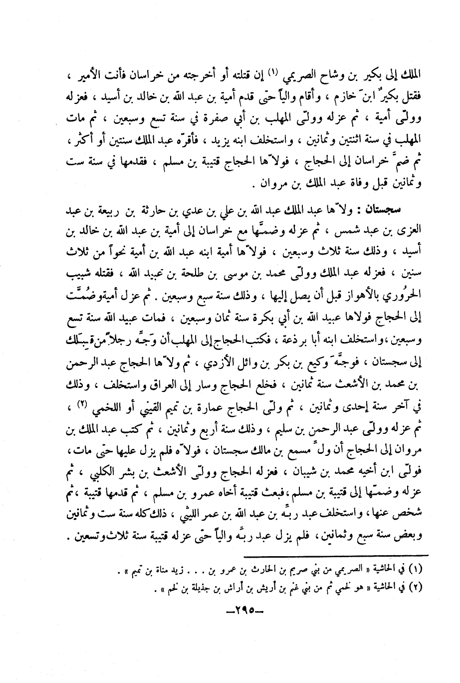 الْملك إِلَى بكير بْن وشاح الصريمي إِن قتلته أَو أخرجته من خُرَاسَان فَأَنت الْأَمِير فَقتل بكير ابْن خازم وَأقَام واليا حَتَّى قدم أُميَّة بْن عَبْد اللَّهِ بْن خَالِد بْن أسيد فَعَزله وَولى أُميَّة ثمَّ عَزله وَولى الْمُهلب بْن أَبِي صفرَة فِي سنة تسع وَسبعين ثمَّ مَاتَ الْمُهلب فِي سنة اثْنَتَيْنِ وَثَمَانِينَ واستخلف ابْنه يَزِيد فأقره عَبْد الْملك سنتَيْن أَو أَكثر ثمَّ ضم خُرَاسَان إِلَى الْحجَّاج فولاها الْحجَّاج قُتَيْبَة بْن مُسلم فَقَدمهَا فِي سنة سِتّ وَثَمَانِينَ قبل وَفَاة عَبْد الْملك بْن مَرْوَان