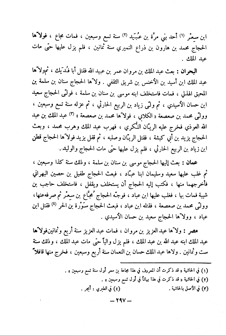 عمان بعث إِلَيْهَا الْحجَّاج مُوسَى بْن سِنَان بْن سَلمَة وَذَلِكَ سنة كَذَا وَسبعين ثمَّ غلب عَلَيْهَا سعيد وَسليمَان ابْنا عباد فَبعث الْحجَّاج طفيل بْن حُصَيْن البهراني فأخرجهما مِنْهَا فَكتب إِلَيْهِ الْحجَّاج أَن يسْتَخْلف ويقفل فاستخلف حَاجِب بْن شيبَة فَمَاتَ بهَا فغلب عَلَيْهَا ابْن عباد فَوجه الْحجَّاج مجاع بْن سعر ثمَّ صرفه عَنها وَولى مُحَمَّد بن صعصعة فَقتله ابْن عباد فَبعث الْحجَّاج سُورَة بْن الْحر فَقتل ابْن عباد وولاها الْحجَّاج سعيد بْن حسان الأسيدي
