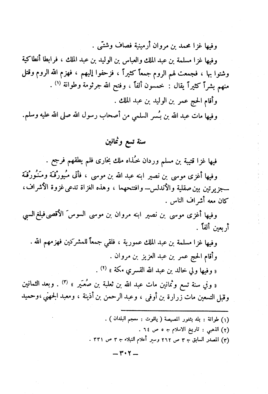 سنة تسع وَثَمَانِينَ فِيهَا غزا قُتَيْبَة بْن مُسلم وردان خذاه ملك بُخَارى فَلم يطقهم فَرجع وفيهَا أغزى مُوسَى بْن نصير ابْنه عَبْد اللَّهِ بْن مُوسَى فَأتى ميورقة ومنورقة جزيرتين بَين صقلية والأندلس وافتتحهما وَهَذِه الْغُزَاة تدعى غَزْوَة الْأَشْرَاف كَانَ مَعَه أَشْرَاف النَّاس وفيهَا أغزى مُوسَى بْن نصير ابْنه مَرْوَان بْن السوس الْأَقْصَى فَبلغ السَّبي أَرْبَعِينَ ألفا وفيهَا غزا مسلمة بْن عَبْد الْملك عمورية فلقي جمعا للْمُشْرِكين فَهَزَمَهُمْ اللَّه وَأقَام الْحَج عُمَر بْن عَبْد الْعَزِيز بْن مَرْوَان وفيهَا ولي خَالِد بْن عبد الله الْقَسرِي مَكَّة