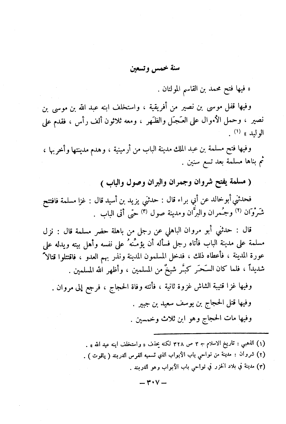 سنة خمس وَتِسْعين فِيهَا فتح مُحَمَّد بْن الْقَاسِم المولتان وفيهَا قفل مُوسَى بْن نصير من أفريقية واستخلف ابْنه عَبْد اللَّهِ بْن مُوسَى بْن نصير وَحمل الْأَمْوَال عَلَى الْعجل وَالظّهْر وَمَعَهُ ثَلَاثُونَ ألف رَأس فَقدم عَلَى الْوَلِيد وفيهَا فتح مسلمة بْن عَبْد الْملك مَدِينَة الْبَاب من أرمينية وَهدم مدينتها وأخربها ثمَّ بناها مسلمة بعد تسع سِنِين