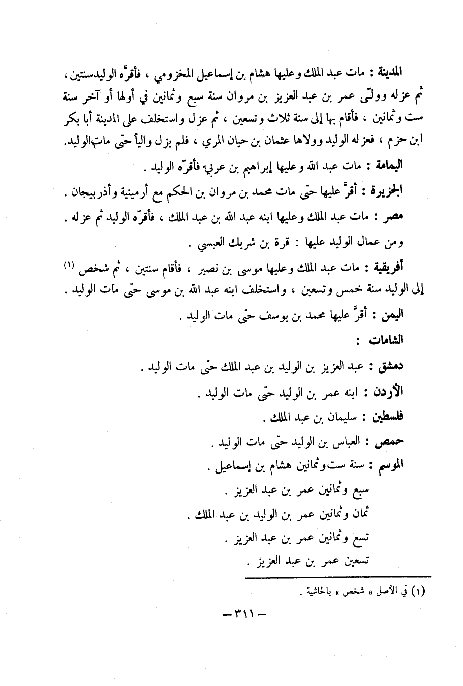 الْمَدِينَة مَاتَ عَبْد الْملك وَعَلَيْهَا هِشَام بْن إِسْمَاعِيل المَخْزُومِي فأقره الْوَلِيد سنتَيْن ثمَّ عَزله وَولى عُمَر بْن عَبْد الْعَزِيز بْن مَرْوَان سنة سبع وَثَمَانِينَ فِي أَولهَا أَو آخر سنة سِتّ وَثَمَانِينَ فَأَقَامَ بهَا إِلَى سنة ثَلَاث وَتِسْعين ثمَّ عزل واستخلف عَلَى الْمَدِينَة أَبَا بَكْر ابْن حزم فَعَزله الْوَلِيد وولاها عُثْمَان نب حَيَّان المري فَلم يزل واليا حَتَّى مَاتَ الْوَلِيد