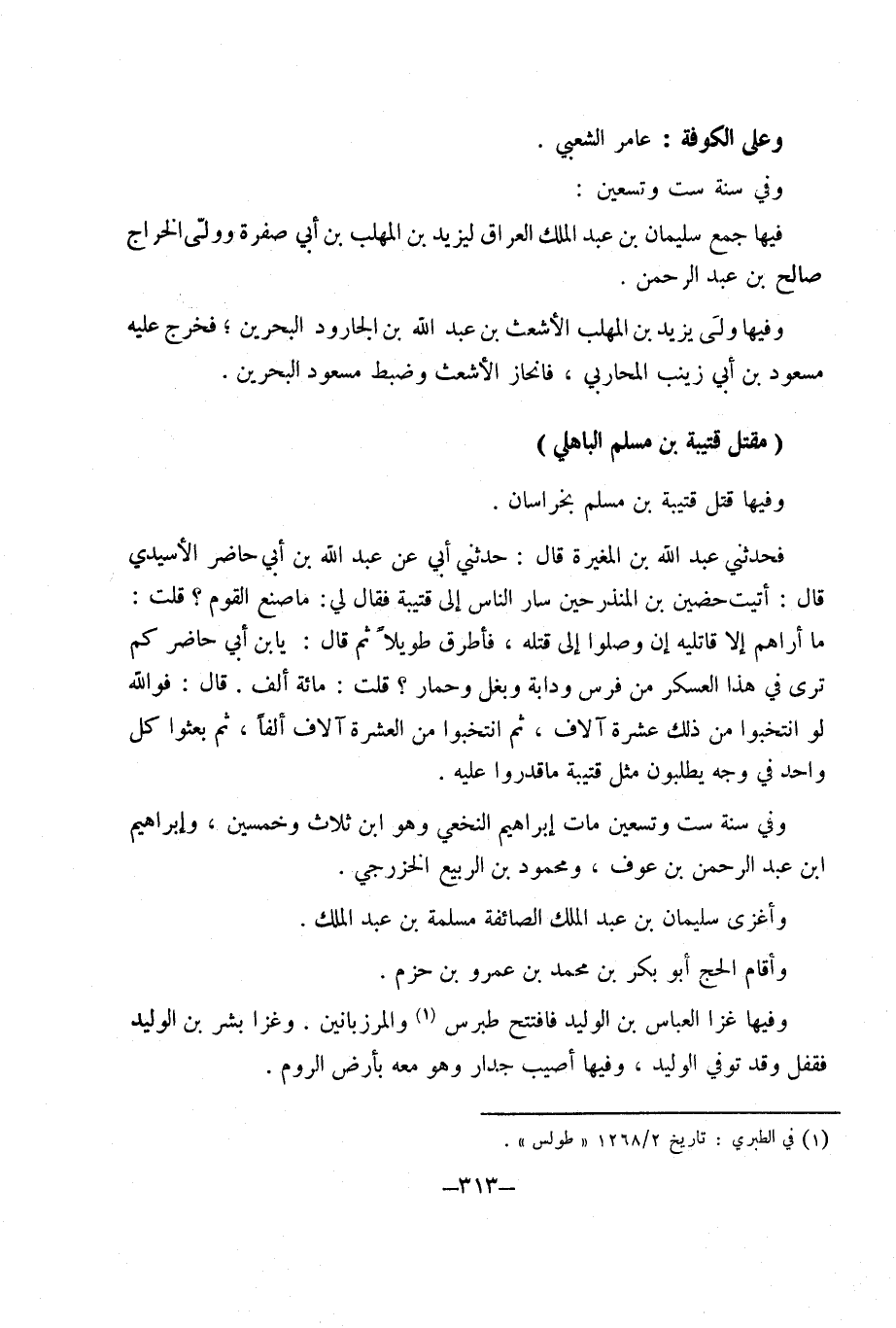 فَحَدثني عَبْد اللَّهِ بْن الْمُغيرَة قَالَ حَدَّثَنِي أَبِي عَن عَبْد اللَّهِ بْن أَبِي حَاضر الأسيدي قَالَ أتيت حضين بْن الْمُنْذر حِين سَار النَّاس إِلَى قُتَيْبَة فَقَالَ لي مَا صنع الْقَوْم قلت مَا أَرَاهُم إِلَّا قاتليه إِن وصلوا إِلَى قَتله فَأَطْرَقَ طَويلا ثمَّ قَالَ يَا بْن أَبِي حَاضر كم ترى فِي هَذَا الْعَسْكَر من فرس ودابة وبغل وحمار قلت مائَة ألف قَالَ فوَاللَّه لَو انتخبوا من ذَلِكَ عشرَة آلَاف ثمَّ انتخبوا من الْعشْرَة آلَاف ألفا ثمَّ بعثوا كل وَاحِد فِي وَجه يطْلبُونَ مثل قُتَيْبَة مَا قدرُوا عَلَيْهِ وَفِي سنة سِتّ وَتِسْعين مَاتَ إِبْرَاهِيم النَّخعِيّ وهوابن ثَلَاث وَخمسين وَإِبْرَاهِيم ابْن عَبْد الرَّحْمَن بْن عَوْف ومحمود بْن الرّبيع الخزرجي وأغزى سُلَيْمَان بْن عَبْد الْملك الصائفة مسلمة بْن عَبْد الْملك وَأقَام الْحَج أَبُو بَكْرِ بن مُحَمَّد بن عَمْرو بن حزم وفيهَا غزا الْعَبَّاس بْن الْوَلِيد فَافْتتحَ طبرس والمرزبانين وغزا بشر بْن الْوَلِيد فقفل وَقد توفّي الْوَلِيد وفيهَا أُصِيب جِدَار وَهُوَ مَعَه بِأَرْض الرّوم