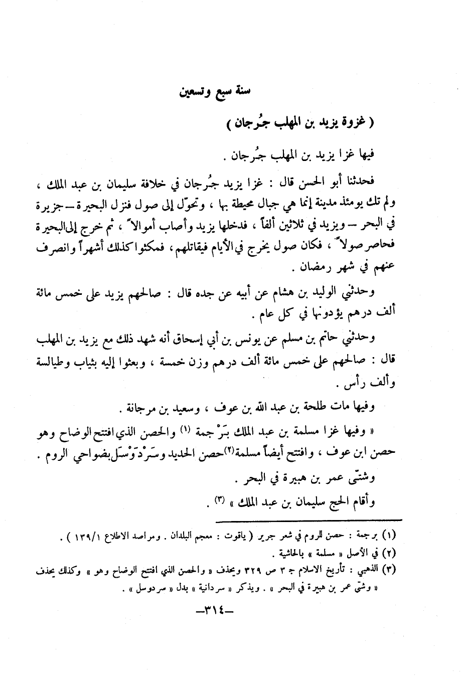غَزْوَة يزِيد بن الْمُهلب جرجان فِيهَا غزا يَزِيد بْن الْمُهلب جرجان فحدثنا أَبُو الْحسن قَالَ غزا يَزِيد جرجان فِي خلَافَة سُلَيْمَان بْن عَبْد الْملك وَلم تَكُ يَوْمئِذٍ مَدِينَة إِنَّمَا هِيَ جبال مُحِيطَة بهَا وتحول إِلَى صول فَنزل الْبحيرَة جَزِيرَة فِي الْبَحْر وَيزِيد فِي ثَلَاثِينَ ألفا فَدَخلَهَا يَزِيد وَأصَاب أَمْوَالًا ثمَّ خرج إِلَى الْبحيرَة فحاصر صولا فَكَانَ صول يخرج فِي الْأَيَّام فيقاتلهم فَمَكَثُوا كَذَلِكَ أشهرا وَانْصَرف عَنهم فِي شهر رَمَضَان وَحَدَّثَنِي الْوَلِيد بْن هِشَامٍ عَنْ أَبِيهِ عَنْ جَدِّهِ قَالَ صَالحهمْ يَزِيد عَلَى خمس مائَة ألف دِرْهَم يؤدونها فِي كل عَام وَحَدَّثَنِي حَاتِم بْن مُسلم عَن يُونُس بْن أَبِي إِسْحَاق أَنه شهد ذَلِكَ مَعَ يَزِيد بْن الْمُهلب قَالَ صَالحهمْ عَلَى خمس مائَة ألف دِرْهَم وزن خَمْسَة وبعثوا إِلَيْهِ بِثِيَاب وطيالسة وَألف رَأس وفيهَا مَاتَ طَلْحَة بْن عَبْد اللَّهِ بْن عَوْف وَسَعِيد بْن مرْجَانَة وفيهَا غزا مسلمة بْن عَبْد الْملك برجمة والحصن الَّذِي افْتتح الوضاح وَهُوَ حصن ابْن عَوْف وافتتح أَيْضا مسلمة حصن الْحَدِيد وسرد وسل بضواحي الرّوم وشتى عُمَر بْن هُبَيْرَة فِي الْبَحْر وَأقَام الْحَج سُلَيْمَان بن عبد الْملك