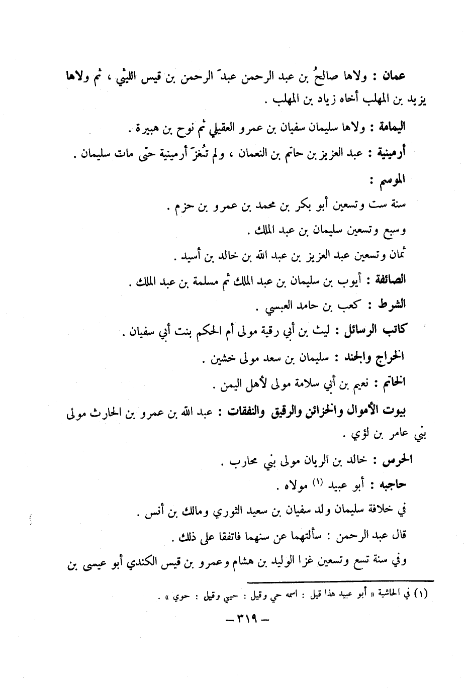حَاجِبه أَبُو عبيد مَوْلَاهُ فِي خلَافَة سُلَيْمَان ولد سُفْيَان بْن سعيد الثَّوْريّ وَمَالك بْن أنس قَالَ عَبْد الرَّحْمَن سألتهما عَن سنهما فاتفقا عَلَى ذَلِكَ وَفِي سنة تسع وَتِسْعين غزا الْوَلِيد بْن هِشَام وَعَمْرو بْن قيس الْكِنْدِيّ أَبُو عِيسَى بن
