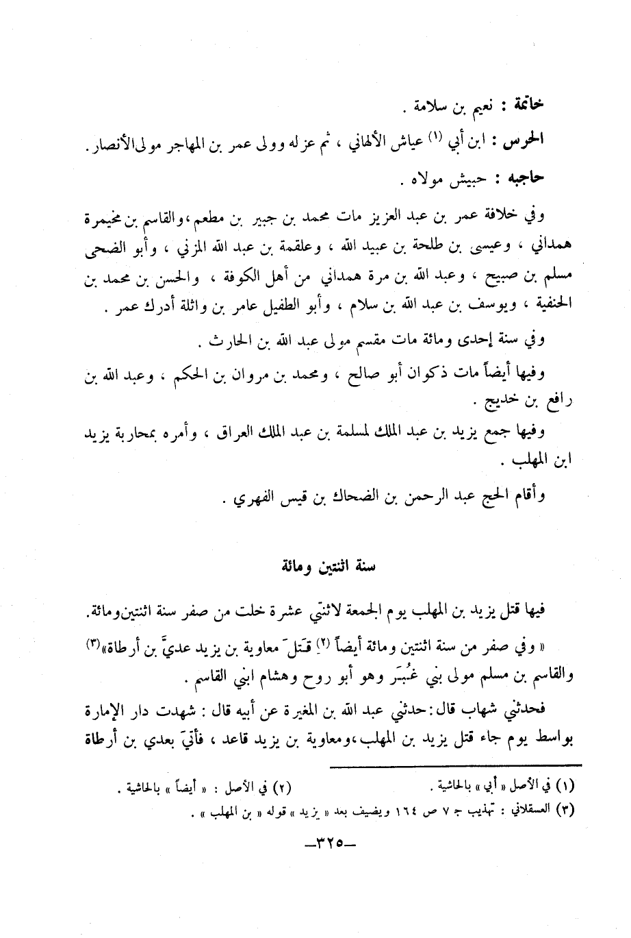 فِيهَا قتل يَزِيد بْن الْمُهلب يَوْم الْجُمُعَة لِاثْنَتَيْ عشرَة خلت من صفر سنة اثْنَتَيْنِ وَمِائَة وَفِي صفر من سنة اثْنَتَيْنِ وَمِائَة أَيْضا قتل مُعَاوِيَة بْن يَزِيد عدي بْن أَرْطَاة وَالقَاسِم بْن مُسلم مولى بَنِي غبر وَهُوَ أَبُو روح وَهِشَام ابْني الْقَاسِم فَحَدثني شهَاب قَالَ حَدَّثَنِي عَبْدُ اللَّهِ بْنُ الْمُغيرَة عَن أَبِيه قَالَ شهِدت دَار الْإِمَارَة بواسط يَوْم جَاءَ قتل يَزِيد بْن الْمُهلب وَمُعَاوِيَة بْن يَزِيد قَاعد فَأتي بعدِي بن ارطاة