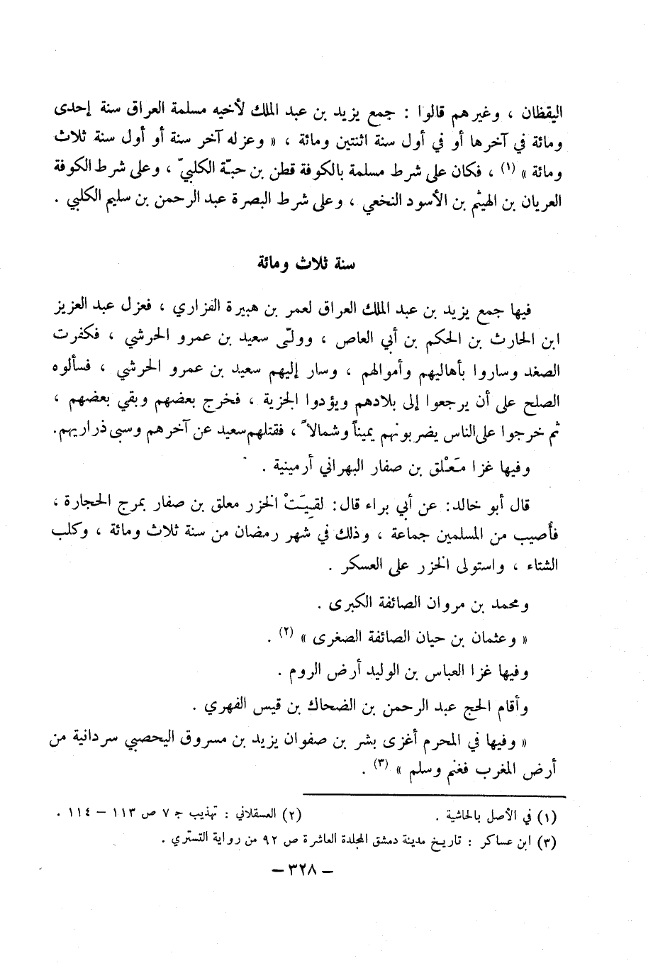 الْيَقظَان وَغَيرهم قَالُوا جمع يَزِيد بْن عَبْد الْملك لِأَخِيهِ مسلمة الْعرَاق سنة إِحْدَى وَمِائَة فِي أَخّرهَا أَو فِي أول سنة اثْنَتَيْنِ وَمِائَة وعزله آخر سنة أَو أول سنة ثَلَاث وَمِائَة فَكَانَ عَلَى شَرط مسلمة بِالْكُوفَةِ قطن بْن حَبَّة الْكَلْبِيّ وعَلى شَرط الْكُوفَة الْعُرْيَان بْن الْهَيْثَم بْن الْأسود النَّخعِيّ وعَلى شَرط الْبَصْرَة عَبْد الرَّحْمَن بْن سليم الْكَلْبِيّ