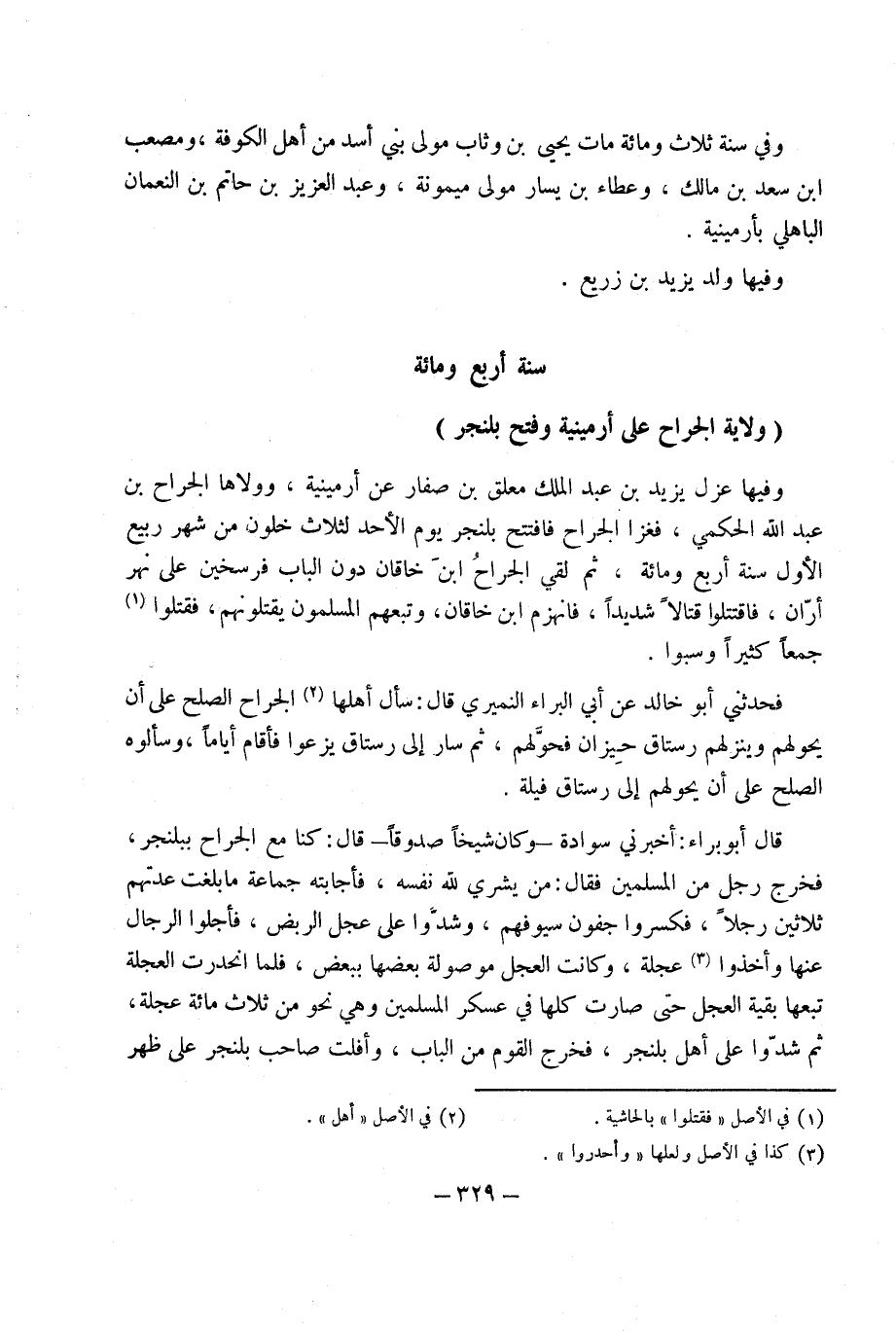 وفيهَا عزل يَزِيد بْن عَبْد الْملك مُعَلّق بْن صفار عَن أرمينية وولاها الْجراح بن عبد الله الْحكمِي فغزا الْجراح فَافْتتحَ بلنجر يَوْم الْأَحَد لثلاث خلون من شهر ربيع الأول سنة أَربع وَمِائَة ثمَّ لَقِي الْجراح ابْن خاقَان دون الْبَاب فرسخين على نهر أران فَاقْتَتلُوا قتالا شَدِيدا فَانْهَزَمَ ابْن خاقَان وتبعهم الْمُسلمُونَ يَقْتُلُونَهُمْ فَقتلُوا جمعا كثيرا وَسبوا