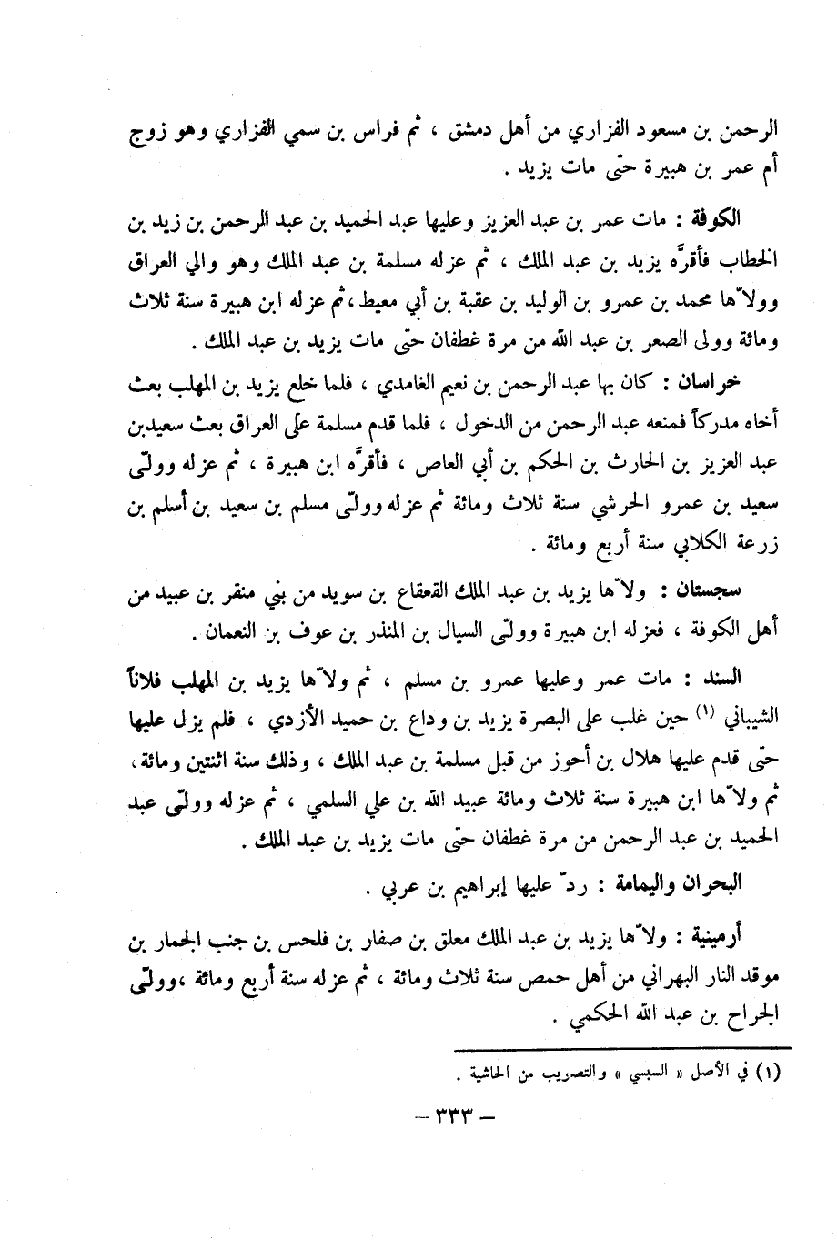 السَّنَد مَاتَ عُمَر وَعَلَيْهَا عَمْرو بْن مُسلم ثمَّ ولاها يَزِيد بْن الْمُهلب فلَانا الشَّيْبَانِيّ حِين غلب عَلَى الْبَصْرَة يَزِيد بْن وداع بْن حميد الْأَزْدِيّ فَلم يزل عَلَيْهَا حَتَّى قدم عَلَيْهَا هِلَال بْن أحوز من قبل مسلمة بْن عَبْد الْملك وَذَلِكَ سنة اثْنَتَيْنِ وَمِائَة ثمَّ ولاها ابْن هُبَيْرَة سنة ثَلَاث وَمِائَة عبيد اللَّه بْن عَلِيّ السّلمِيّ ثمَّ عَزله وَولى عَبْد الحميد بْن عَبْد الرَّحْمَن من مرّة غطفان حَتَّى مَاتَ يَزِيد بْن عَبْد الْملك