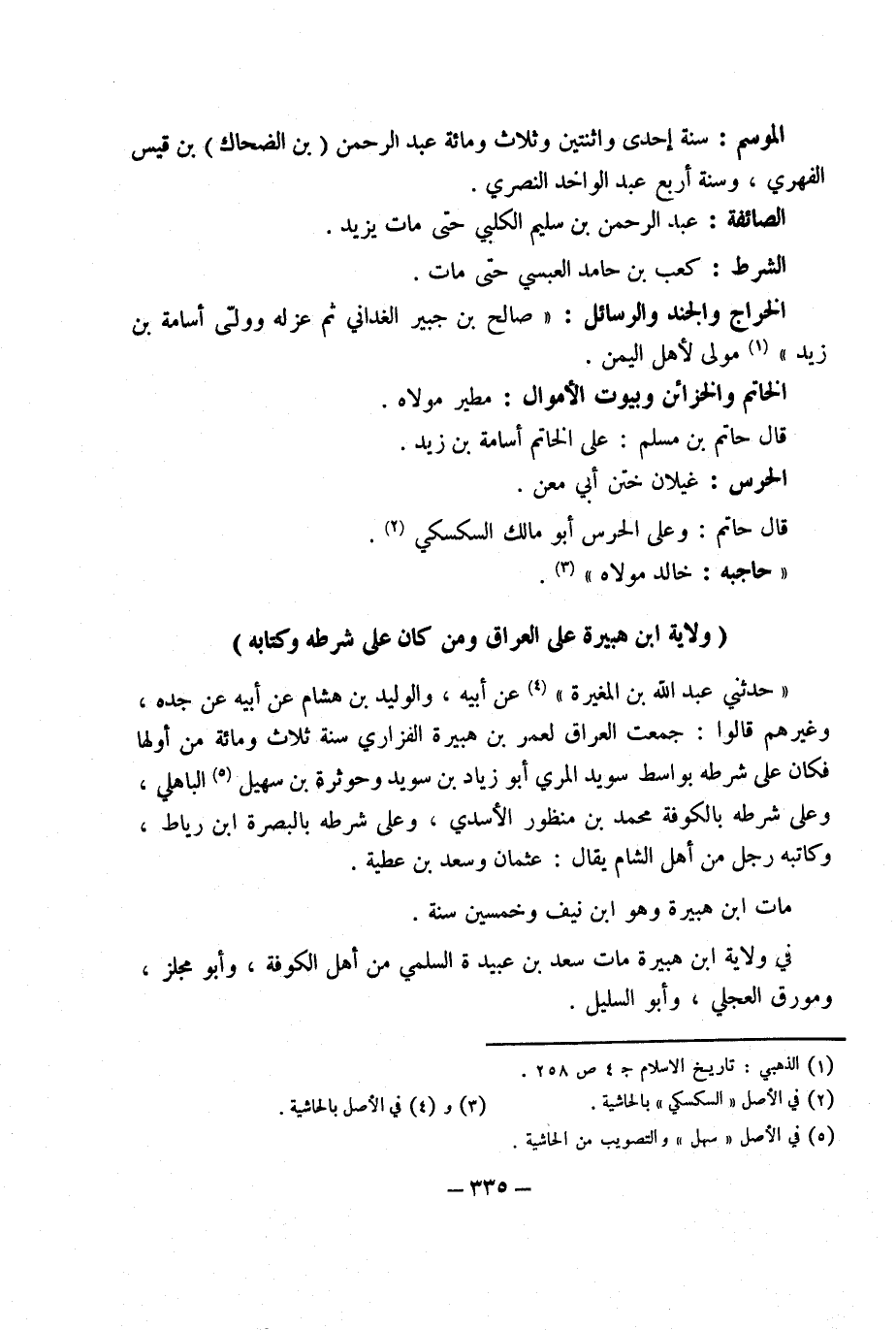 حَدَّثَنِي عَبْد اللَّهِ بْن الْمُغيرَة عَن أَبِيه والوليد بْن هِشَام عَن أَبِيه عَن جده وَغَيرهم قَالُوا جمعت الْعرَاق لعمر بْن هُبَيْرَة الْفَزارِيّ سنة ثَلَاث وَمِائَة من أَولهَا فَكَانَ عَلَى شَرطه بواسط سُوَيْد المري أَبُو زِيَاد بْن سُوَيْد وحوثرة بْن سُهَيْل الْبَاهِلِيّ وعَلى شَرطه بِالْكُوفَةِ مُحَمَّد بْن مَنْظُور الْأَسدي وعَلى شَرطه بِالْبَصْرَةِ ابْن رياط وكاتبه رجل من أهل الشَّام يُقَال عُثْمَان وَسعد بْن عَطِيَّة مَاتَ ابْن هُبَيْرَة وَهُوَ ابْن نَيف وَخمسين سنة