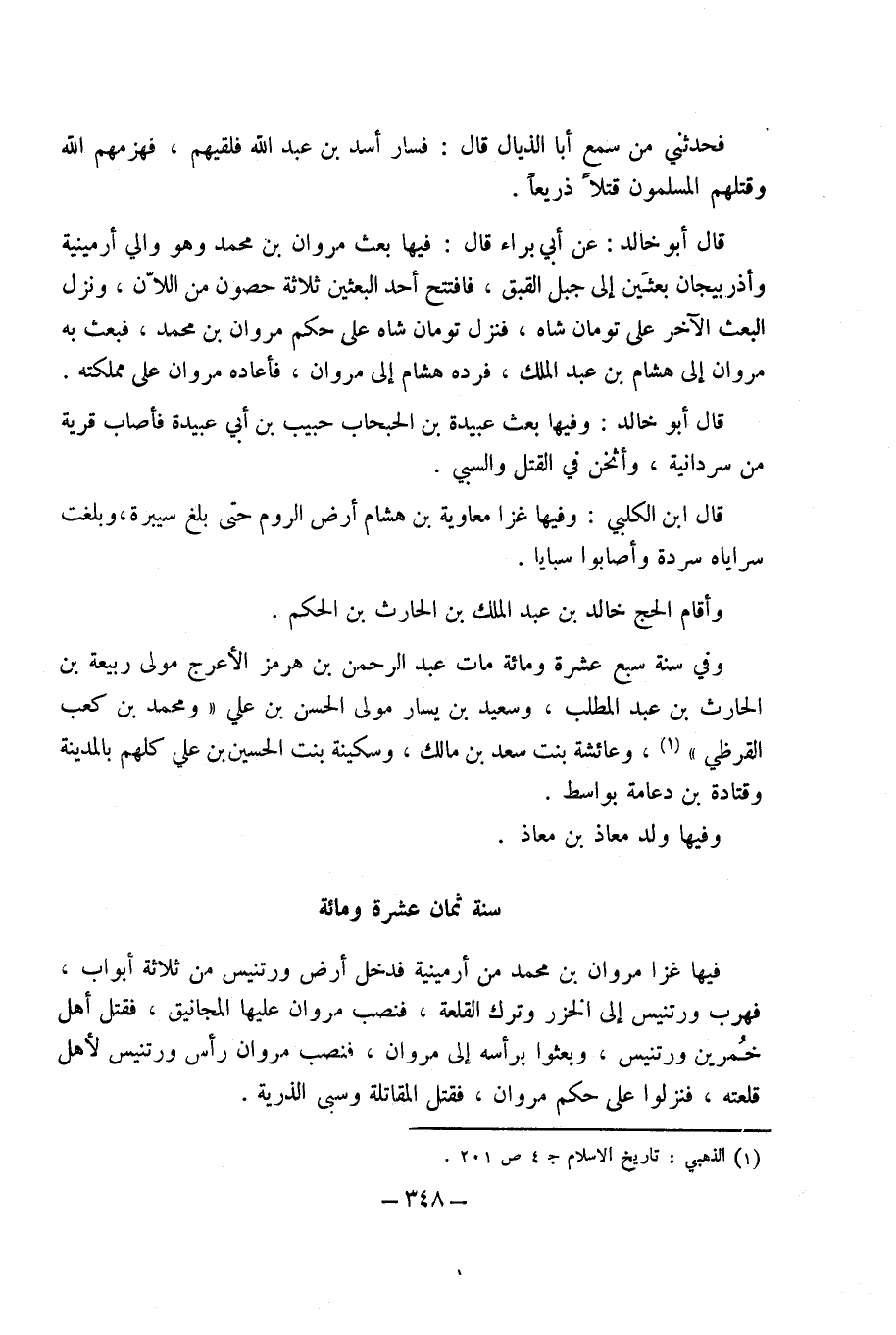 قَالَ أَبُو خَالِد عَن أَبِي برَاء قَالَ فِيهَا بعث مَرْوَان بْن مُحَمَّد وَهُوَ وَالِي أرمينية وأذربيجان بعثين إِلَى جبل القبق فَافْتتحَ أحد البعثين ثَلَاثَة حصون من اللان وَنزل الْبَعْث الآخر عَلَى تومان شاه فَنزل تومان شاه عَلَى حكم مَرْوَان بْن مُحَمَّد فَبعث بِهِ مَرْوَان إِلَى هِشَام بْن عَبْد الْملك فَرده هِشَام إِلَى مَرْوَان فَأَعَادَهُ مَرْوَان عَلَى مَمْلَكَته قَالَ أَبُو خَالِد وفيهَا بعث عُبَيْدَة بْن الحبحاب حبيب بْن أَبِي عُبَيْدَة فَأصَاب قَرْيَة من سردانية وأثخن فِي الْقَتْل والسبي