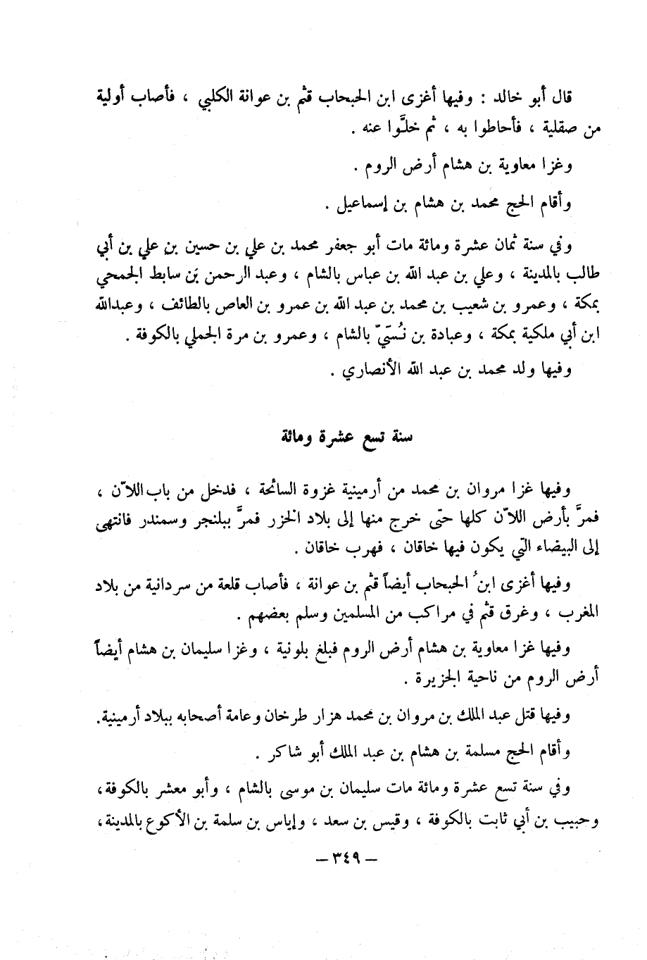 قَالَ أَبُو خَالِد وفيهَا أغزى ابْن الحبحاب قثم بْن عوَانَة الْكَلْبِيّ فَأصَاب أولية من صقلية فأحاطوا بِهِ ثمَّ خلوا عَنه وغزا مُعَاوِيَة بْن هِشَام أَرض الرّوم وَأقَام الْحَج مُحَمَّد بْن هِشَام بْن إِسْمَاعِيل وَفِي سنة ثَمَان عشرَة وَمِائَة مَاتَ أَبُو جَعْفَرٍ مُحَمَّدُ بْنُ عَلِيِّ بْنِ حُسَيْن بْن عَلِيّ بْن أَبِي طَالب بِالْمَدِينَةِ وَعلي بْن عَبْد اللَّهِ بْن عَبَّاس بِالشَّام وَعبد الرَّحْمَن بْن سابط الجُمَحِي بِمَكَّة وَعَمْرو بْن شُعَيْب بْن مُحَمَّد بْن عَبْد اللَّهِ بْن عَمْرو بْن الْعَاصِ بِالطَّائِف وَعبد اللَّه ابْن أَبِي مليكَة بِمَكَّة وَعبادَة بْن نسي بِالشَّام وَعَمْرو بْن مرّة الْجملِي بِالْكُوفَةِ وفيهَا ولد مُحَمَّد بْن عَبْد اللَّهِ الْأنْصَارِيّ