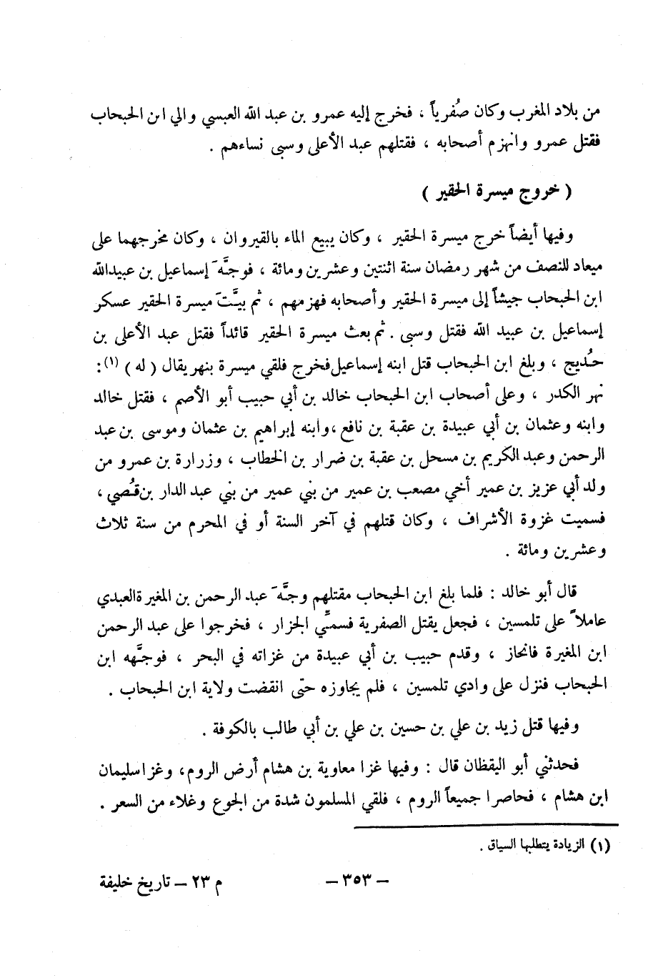 وفيهَا أَيْضا خرج ميسرَة الحقير وَكَانَ يَبِيع المَاء بالقيروان وَكَانَ مخرجهما عَلَى ميعاد لِلنِّصْفِ من شهر رَمَضَان سنة اثْنَتَيْنِ وَعشْرين وَمِائَة فَوجه إِسْمَاعِيل بْن عبيد اللَّه ابْن الحبحاب جَيْشًا إِلَى ميسرَة الحقير وَأَصْحَابه فَهَزَمَهُمْ ثمَّ بَيت ميسرَة الحقير عَسْكَر إِسْمَاعِيل بْن عبيد اللَّه فَقتل وسبى ثمَّ بعث ميسرَة الحقير قائدا فَقتل عَبْد الْأَعْلَى بْن حديج وَبلغ ابْن الحبحاب قتل ابْنه إِسْمَاعِيل فَخرج فلقي ميسرَة بنهر يُقَال لَهُ نهر الكدر وعَلى أَصْحَاب ابْن الحبحاب خَالِد بْن أَبِي حبيب أَبُو الْأَصَم فَقتل خَالِد وَابْنه وَعُثْمَان بْن أَبِي عُبَيْدَة بْن عقبَة بْن نَافِع وَابْنه إِبْرَاهِيم بْن عُثْمَان ومُوسَى بْن عَبْد الرَّحْمَن وَعبد الْكَرِيم بْن مسحل بْن عقبَة بْن ضرار بْن الْخطاب وزرارة بْن عَمْرو من ولد أَبِي عَزِيز بْن عُمَيْر أخي مُصعب بْن عُمَيْر من بَنِي عَبْد الدَّار بْن قصي فسميت غَزْوَة الْأَشْرَاف وَكَانَ قَتلهمْ فِي آخر السّنة أَو فِي الْمحرم من سنة ثَلَاث وَعشْرين وَمِائَة