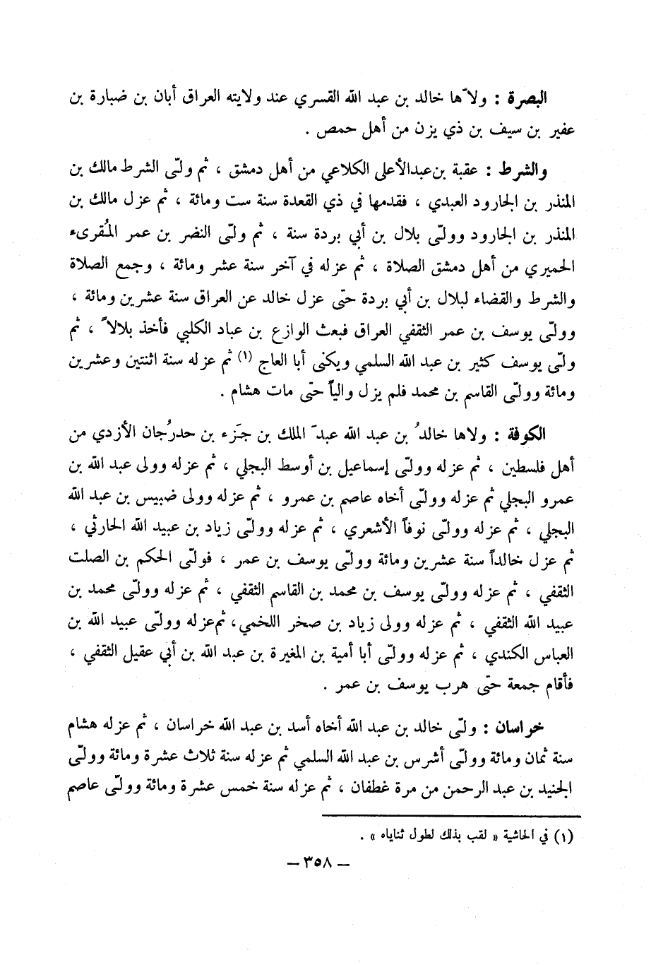 خُرَاسَان ولى خَالِد بْن عَبْد اللَّهِ أَخَاهُ أَسد بْن عَبْد اللَّهِ خُرَاسَان ثمَّ عَزله هِشَام سنة ثَمَان وَمِائَة وَولى أَشْرَس بْن عَبْد اللَّهِ السّلمِيّ ثمَّ عَزله سنة ثَلَاث عشرَة وَمِائَة وَولى الْجُنَيْد بْن عَبْد الرَّحْمَن من مرّة غطفان ثمَّ عَزله سنة خمس عشرَة وَمِائَة وَولى عَاصِم