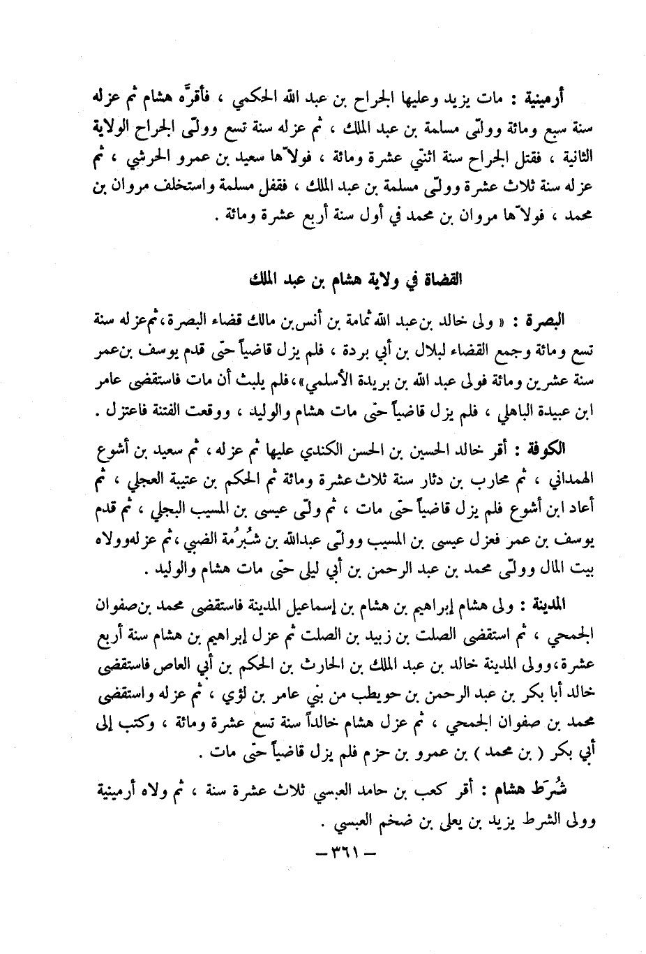 الْكُوفَة أقرّ خَالِد الْحُسَيْن بْن الْحسن الْكِنْدِيّ عَلَيْهَا ثمَّ عَزله ثمَّ سعيد بْن أَشوع الْهَمدَانِي ثمَّ محَارب بْن دثار سنة ثَلَاث عشرَة وَمِائَة ثمَّ الحكم بْن عتيبة الْعجلِيّ ثمَّ أعَاد ابْن أَشوع فَلم يزل قَاضِيا حَتَّى مَاتَ ثمَّ ولى عِيسَى بْن الْمسيب البَجلِيّ ثمَّ قدم يُوسُف بْن عُمَر فعزل عِيسَى بن الْمسيب وَولى عبداالله بْن شبْرمَة الضَّبِّيّ ثمَّ عَزله وولاه بَيت المَال وَولى مُحَمَّد بْنِ عَبْدِ الرَّحْمَنِ بْنِ أَبِي ليلى حَتَّى مَاتَ هِشَام والوليد