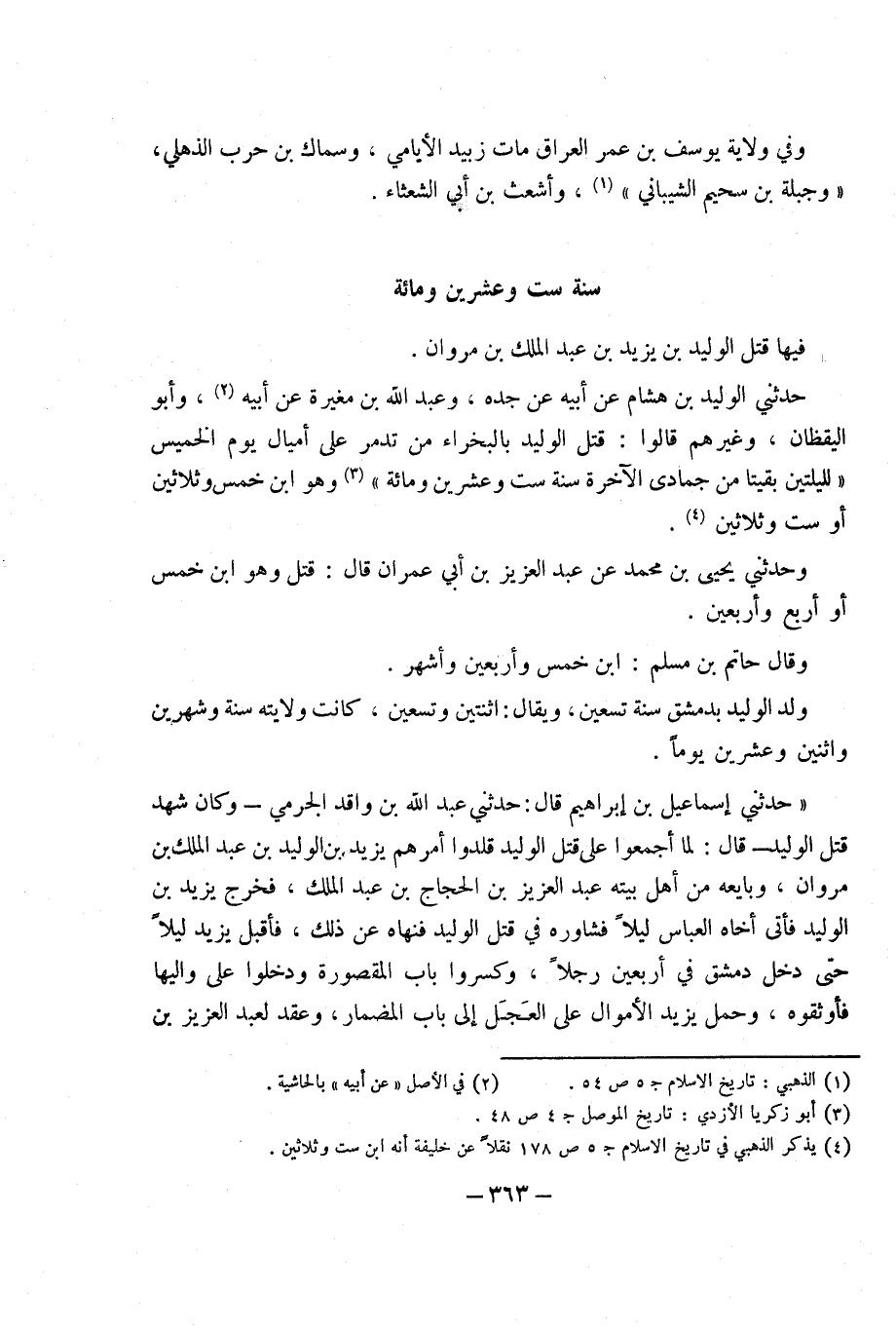 حَدَّثَنِي الْوَلِيد بْنُ هِشَامٍ عَنْ أَبِيهِ عَنْ جده وَعبد اللَّه بْن مُغيرَة عَن أَبِيه وَأَبُو الْيَقظَان وَغَيرهم قَالُوا قتل الْوَلِيد بالبخراء من تدمر عَلَى أَمْيَال يَوْم الْخَمِيس لليلتين بَقِيَتَا من جُمَادَى الْآخِرَة سنة سِتّ وَعشْرين وَمِائَة وَهُوَ ابْن خمس وَثَلَاثِينَ أَو سِتّ وَثَلَاثِينَ
