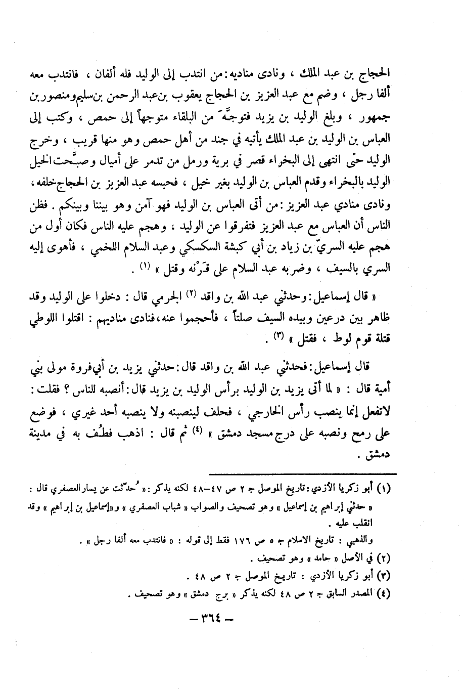 الْحجَّاج بْن عَبْد الْملك ونادى مناديه من انتدب إِلَى الْوَلِيد فَلهُ أَلفَانِ فَانْتدبَ مَعَه ألفا رجل وَضم مَعَ عَبْد الْعَزِيز بْن الْحجَّاج يَعْقُوب بْن عَبْد الرَّحْمَن بْن سليم وَمَنْصُور بْن جُمْهُور وَبلغ الْوَلِيد بْن يَزِيد فَتوجه من البلقاء مُتَوَجها إِلَى حمص وَكتب إِلَى الْعَبَّاس بْن الْوَلِيد بْن عَبْد الْملك يَأْتِيهِ فِي جند من أهل حمص وَهُوَ مِنْهَا قريب وَخرج الْوَلِيد حَتَّى انْتهى إِلَى البخراء قصر فِي بَريَّة وَرمل بْن تدمر عَلَى أَمْيَال وصبحت الْخَيل الْوَلِيد بالبخراء وَقدم الْعَبَّاس بْن الْوَلِيد بِغَيْر خيل فحبسه عَبْد الْعَزِيز بْن الْحجَّاج خَلفه ونادى مُنَادِي عَبْد الْعَزِيز من أَتَى الْعَبَّاس بْن الْوَلِيد فَهُوَ آمن وَهُوَ بَيْننَا وَبَيْنكُم فَظن النَّاس أَن الْعَبَّاس مَعَ عَبْد الْعَزِيز فَتَفَرَّقُوا عَن الْوَلِيد وهجم عَلَيْهِ النَّاس فَكَانَ أول من هجم عَلَيْهِ السّري بْن زِيَاد بْن أَبِي كَبْشَة السكْسكِي وَعبد السَّلَام اللَّخْمِيّ فَأَهوى إِلَيْهِ السّري بِالسَّيْفِ وضربه عَبْد السَّلَام عَلَى قرنه وَقتل