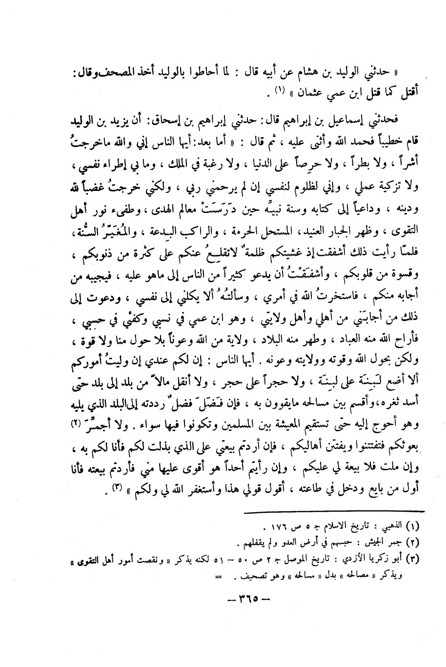 فَحَدثني إِسْمَاعِيل بْن إِبْرَاهِيم قَالَ حَدَّثَنِي إِبْرَاهِيم بْن إِسْحَاق أَن يَزِيد بْن الْوَلِيد قَامَ خَطِيبًا فَحَمدَ اللَّه وَأثْنى عَلَيْهِ ثمَّ قَالَ أما بعد أَيهَا النَّاس إِنِّي وَالله مَا خرجت أشرا وَلَا بطرا وَلَا حرصا عَلَى الدُّنْيَا وَلَا رَغْبَة فِي الْملك وَمَا بِي إطراء نَفسِي وَلَا تَزْكِيَة عَمَلي وَإِنِّي لظلوم لنَفْسي إِن لم يرحمني رَبِّي وَلَكِنِّي خرجت غَضبا لله وَدينه وداعيا إِلَى كِتَابه وَسنة نبيه حِين درست معالم الْهدى وطفئ نور أهل التَّقْوَى وَظهر الْجَبَّار العَنيد المستحل الْحُرْمَة والراكب الْبِدْعَة والمغير السّنة فَلَمَّا رَأَيْت ذَلِكَ أشفقت إِذْ غشيتكم ظلمَة لَا تقلع عَنكم عَلَى كَثْرَة من ذنوبكم وقسوة من قُلُوبكُمْ وأشفقت أَن يَدْعُو كثير من النَّاس إِلَى مَا هُوَ عَلَيْهِ فَيُجِيبهُ من أَجَابَهُ مِنْكُم فاستخرت اللَّه فِي أَمْرِي وَسَأَلته أَلا يكلني إِلَى نَفسِي ودعوت إِلَى ذَلِكَ من أجابني من أَهلِي وَأهل ولايتي وَهُوَ ابْن عمي فِي نسبي وكفئي فِي حسبي فأراح اللَّه مِنْهُ الْعباد وطهر مِنْهُ الْبِلَاد ولَايَة من اللَّه وعونا بِلَا حول منا وَلَا قُوَّة وَلَكِن بحول اللَّه وقوته وولايته وعونه أَيهَا النَّاس إِن لكم عَندي إِن وليت أُمُوركُم أَلا أَضَع لبنة عَلَى لبنة وَلَا حجرا عَلَى حجر وَلَا أنقل مَالا من بلد إِلَى بلد حَتَّى أَسد ثغره وَأقسم بَين مسالحه مَا يقوون بِهِ فَإِن فضل فضل رَددته إِلَى الْبَلَد الَّذِي يَلِيهِ وَهُوَ أحْوج إِلَيْهِ حَتَّى تستقيم الْمَعيشَة بَين الْمُسلمين وتكونوا فِيهَا سَوَاء وَلَا أجمر بعوثكم فتفتتنوا ويفتتن أهاليكم فَإِن أردتم بيعتي عَلَى الَّذِي بذلت لكم فَأَنا لكم بِهِ وَإِن ملت فَلَا بيعَة لي عَلَيْكُم وَإِن رَأَيْتُمْ أحدا هُوَ أقوى عَلَيْهَا مني فأردتم بيعَته فَأَنا أول من بَايع وَدخل فِي طَاعَته أَقُول قولي هَذَا وَأَسْتَغْفِر اللَّه لي وَلكم