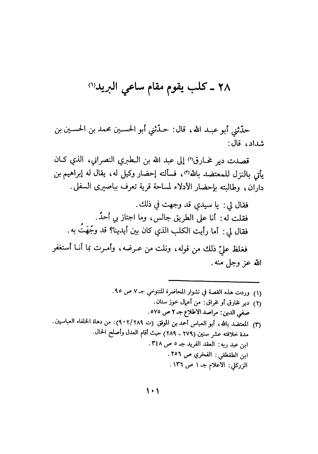 وحدثني أبو عبد الله قال حدثني أبو الحسين محمد بن الحسين ابن شداد قال قصدت دير مخارق إلى عبد الله بن الطبري النصراني الذي كان يأتي بالنزل للمعتضد بالله فسالته إحضار وكيل له يقال له إبراهيم بن داران وطالبته بإحضار الأدلاء لمسامحة قرية تعرف بباصيري السفلي فقال لي يا سيدي قد وجهت في ذلك فقلت له أنا على الطريق جالس وما اجتاز بي أحد فقال لي أما رأيت الكلب الذي كان بين أيدينا قد وجهت به فغلط ذلك من قوله ونلت من عرضه وأمرت بما أنا أستغفر الله عز وجل منه@