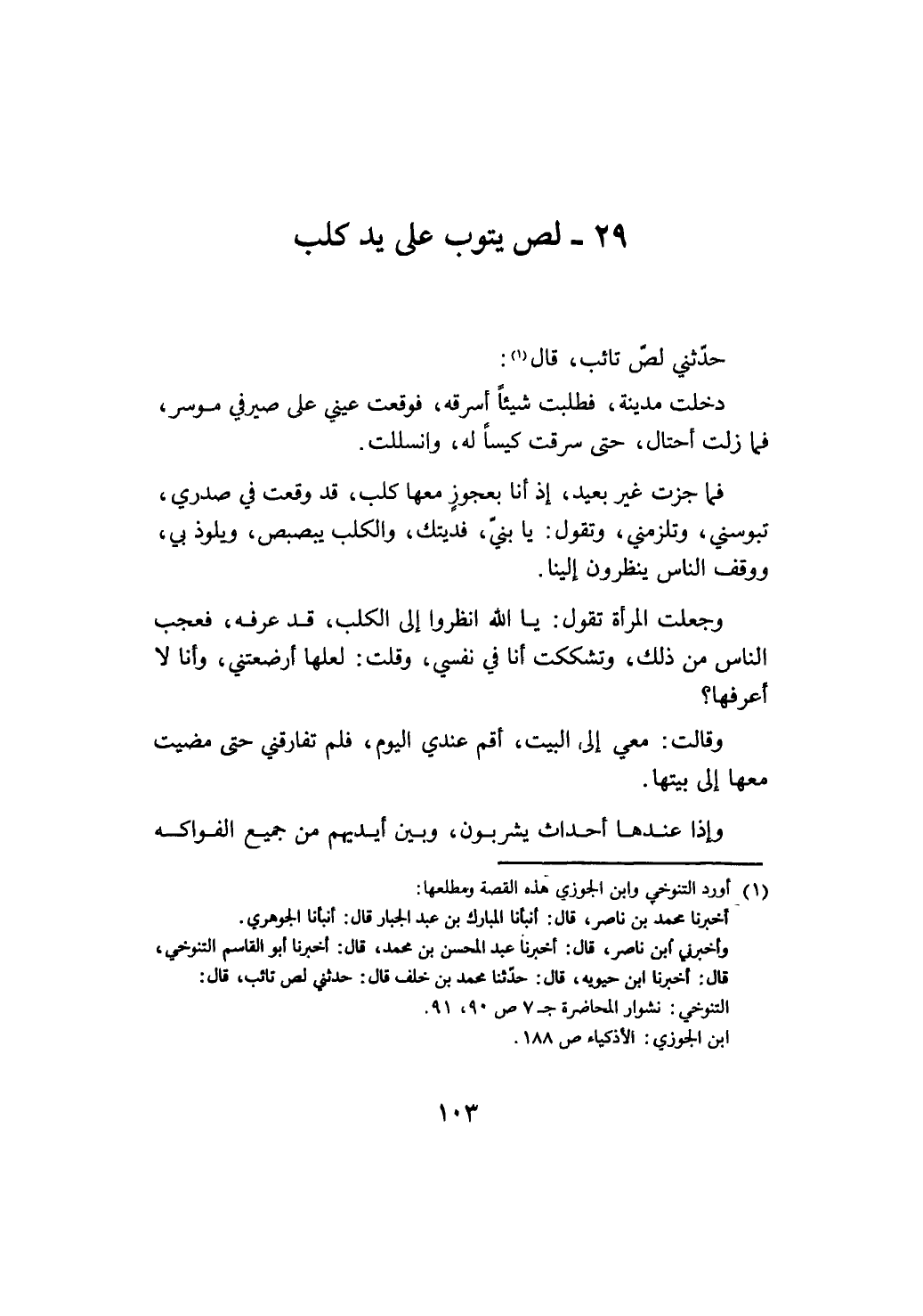 وحدثني لص تائب قال دخلت مدينة قد ذكروها إلي فجعلت أطالب شيئا أسرقه فلم أصب ووقعت عيني على صير في موسر فما زلت احتال حتى سرقت كيسا له وانسللت فما جزت غير بعيد وإذا عجوز معها كلب قد وقعت على صدري تبوسني وتلزمني وتقول يابني فديتك والكلب يبصبص ويلوذ بي ووقف الناس ينظرون إلينا وجعلت المرأة تقول بالله انظروا إلى الكلب كيف قد عرفه فعجب الناس من ذلك وشككت أنا في نفسي وقلت لعلها أرضعتني وأنا لا أعرفها وقالت سر معي إلى البيت أقيم