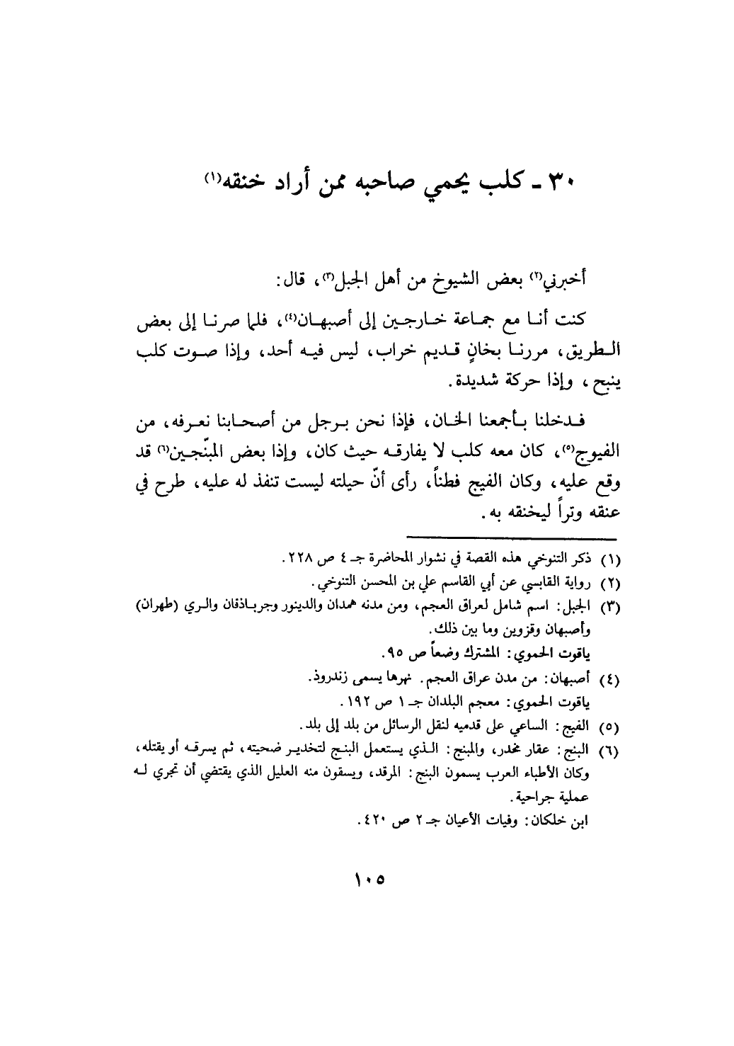 أخبرني بعض الشيوخ من أهل الحيل قال كنت أنا مع جماعة خارجين إلى أصبهان فلما صرنا إلى بعض الطريق مررنا بخان قديم خراب ليس فيه أحد وإذا صوت كلب ينبح وإذا حركة شديدة فدخلنا بأجمعنا الخان فإذا نحن برجل من أصحابنا نعرفه من الفيوح كان معه كلب لا يفارقه حيث كان وإذا بعض المبنجمين تنفذ وقع عليه فكان الفيح وطنا فلما رأى حيلته ليس تنفذ له عليه طرح في عنقه وترا ليخنقه به@