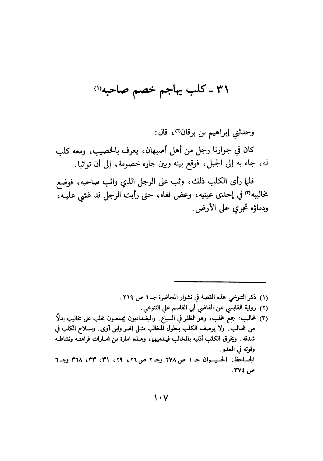 وحدثني إبراهيم بن برقان قال كان في جوارنا رجل من أهل أصبهان يعرف بالخصيب ومعه كلب له جاء به من الجبل فوقع بينه وبين جاره خصومة إلى أن تواثبا فلما رأى الكلب ذلك وثب على الرجل الذي واثب صاحبه فوضع مخاليبه في أحد عينيه وعض قفاه حتى رأيت الرجل قد غشي عليه ودماؤه تجري على الأرض@