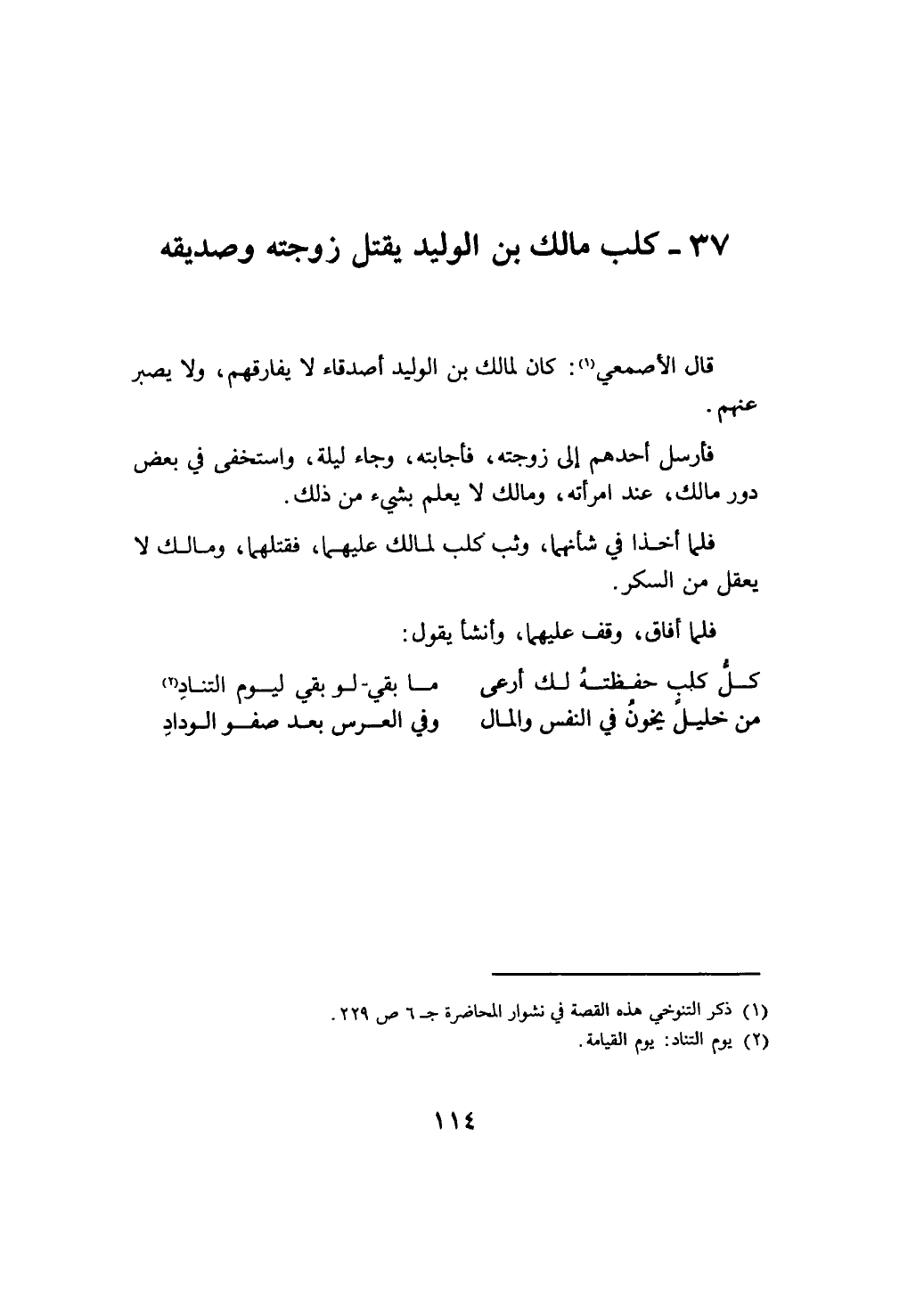 قال الأصمعي كان لمالك بن الوليد أصدقاء لا يفارقهم ولا يصبر عنهم فأرسل أحدهم إلى زوجته فأجابته وجاء ليلة واستخفى في بعض دور مالك عند امرأته ومالك لا بعلم شيء من ذلك فلما أخذ في شأنها وثب لمالك عليهما فقتلهما ومالك لا يعقل من السكر فلما أفاق وقف عليهما وأنشأ يقول