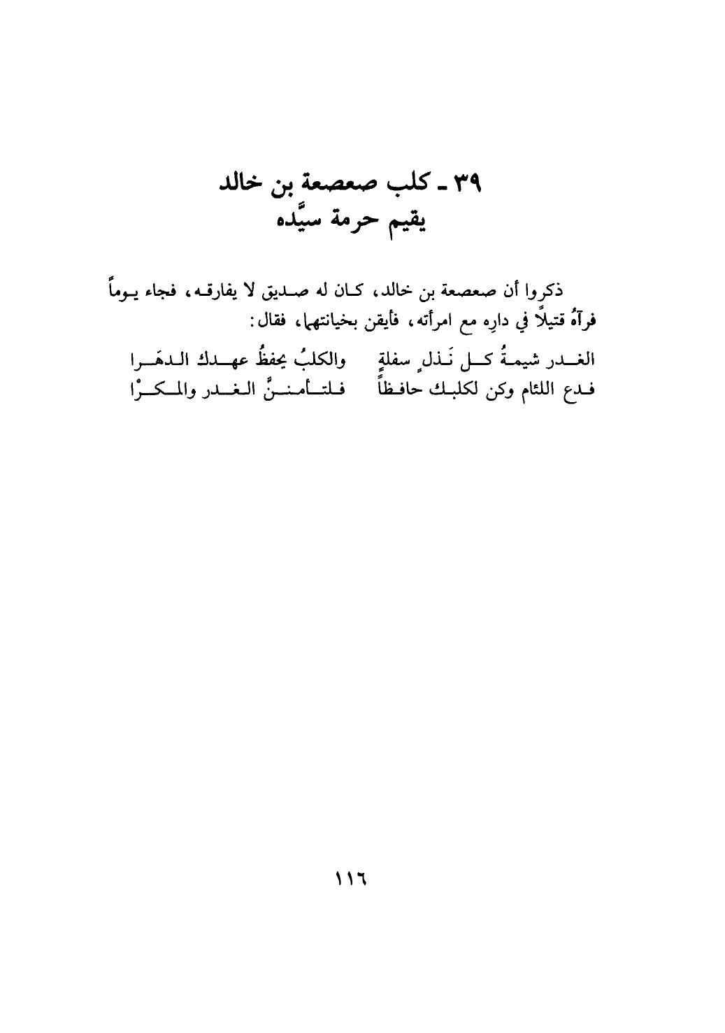 ذكرو أن صعصعة بن خالد كان له صديق لا يفارقه فجاء يوما فرآه قتيلا على فراشه مع امرأته فأيقن بخيانتهما فقال