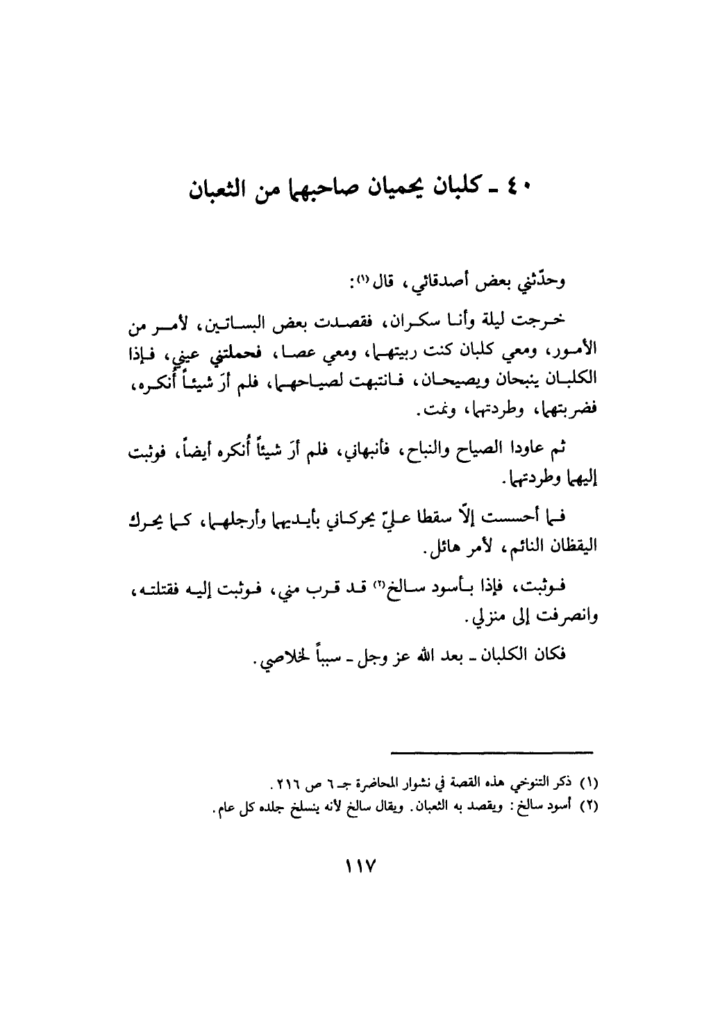خرجت ليلة وأنا سكران فقصدت بعض البساتين لأمر من الأمور ومعي كلبان كنت ربيتهما ومعي عصا فحملتني عيني فإذا الكلبان ينبحان ويصيحان فانتبهت بصياحهما فلم أر شيئا أنكره فضربتهما وطردتهما ونمت ثم عادوا الصياح والنباح فأنبهاني فلم أر شيئا أنكره أيضا فوثبت إليهما وطردتهما فما أحسست إلا وقد سقطا علي يحركاني بأيديهما وأرجلهما كما يحرك اليقظان النائم لأمر هائل فوثبت فإذا بأسود سالح قد قرب مني فوثبت إليه فقتلته وانصرفت إلى منزلي فكان الكلبان بعد الله عز وجل سببا لخلاصي@