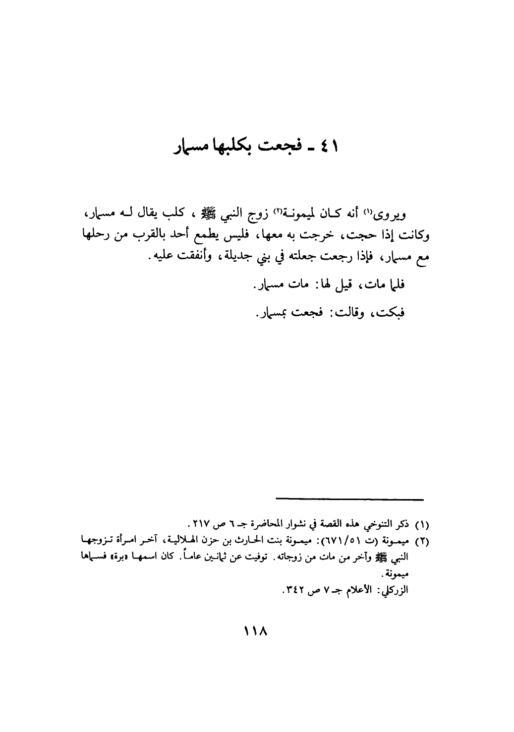 ويروى أنه كان لميمونة زوج النبي صلى الله عليه وسلم كلب يقال له مسمار وكان إذا حجت خرجت به معها فليس يطمع أحد بالقرب من رحلها مع مسمار فإذا رجعت جعلته في بني جديلة وأنفقت عليه فلما مات قيل لها مات مسمار فبكن وقالت فجعت بمسمار@