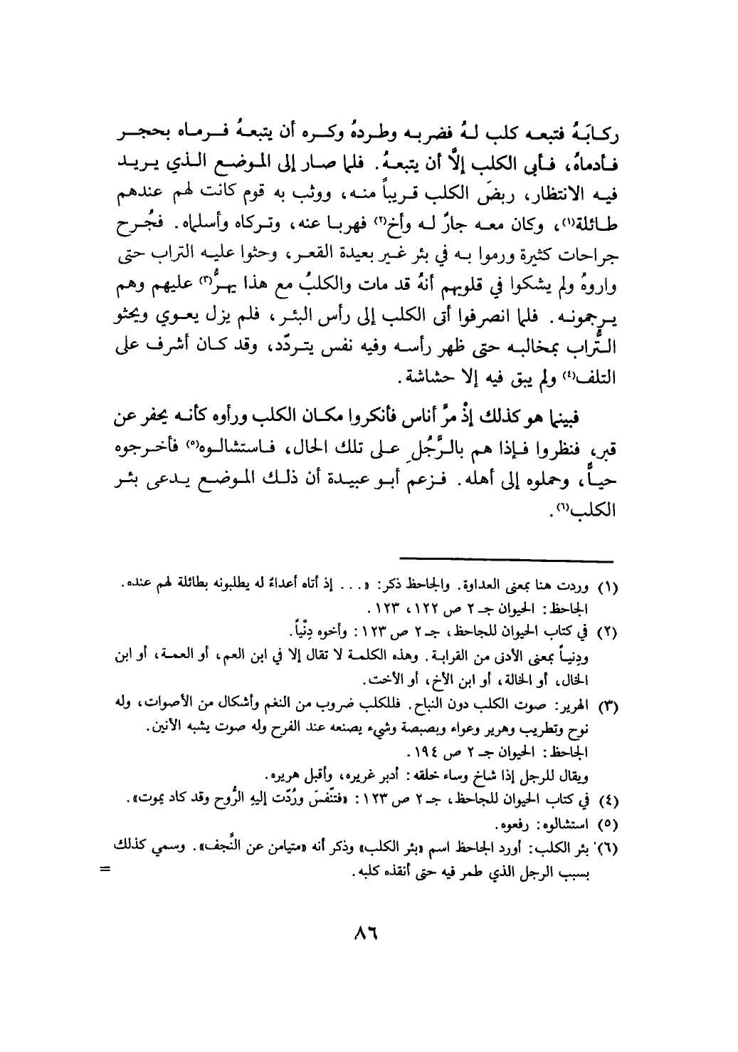 ركابه فاتبعه كلب له فطرده وضربه وذكر أن يتبعه ورماه بحجر فأدماه فأبى الكلب ألا أن يتبعه فلما صار إلى الموضع وثب به قوم كانت لهم عنده طائلة وكان معه جار له وأخ فهربا عنه وتركاه وأسلماه فجرح جرحات كثيرة ورمى به في بئر وحثوا عليه بالتراب حتى واروه ولم يشكوا في موته والكلب مع هذا يهر عليهم وهم يرجمونه فلما انصرفوا أتى الكلب إلى رأس البئر فلم يزل يعوي ويبحث بالتراب بمخاليبه حتى ظهر رأس صاحبه وفيه نفس يتردد وقد كان أشرف على التلف ولو يبق فيه إلا حشاشة نفسه ووصل إليه الروح فبينما هو كذلك إذ مر أناس فأنكروا مكان الكلب ورأوه كأنه يحفر قبرا فجاؤوا فإذا هم بالرجل على تلك الحال فاستخرجوه حيا وحملوه إلى أهله فزعم أبو عبيدة أن ذلك الموضع يدعى بئر الكلب@