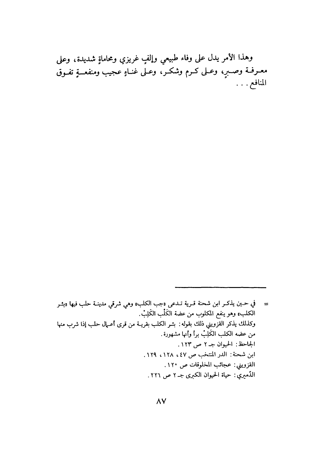 وهذا الأمر يدل على وفاء طبعي وإلف غريزي ومحاباة شديدة وعلى معرفة وصبر وكرم وغناء ومنفعة تفوق المنافع@
