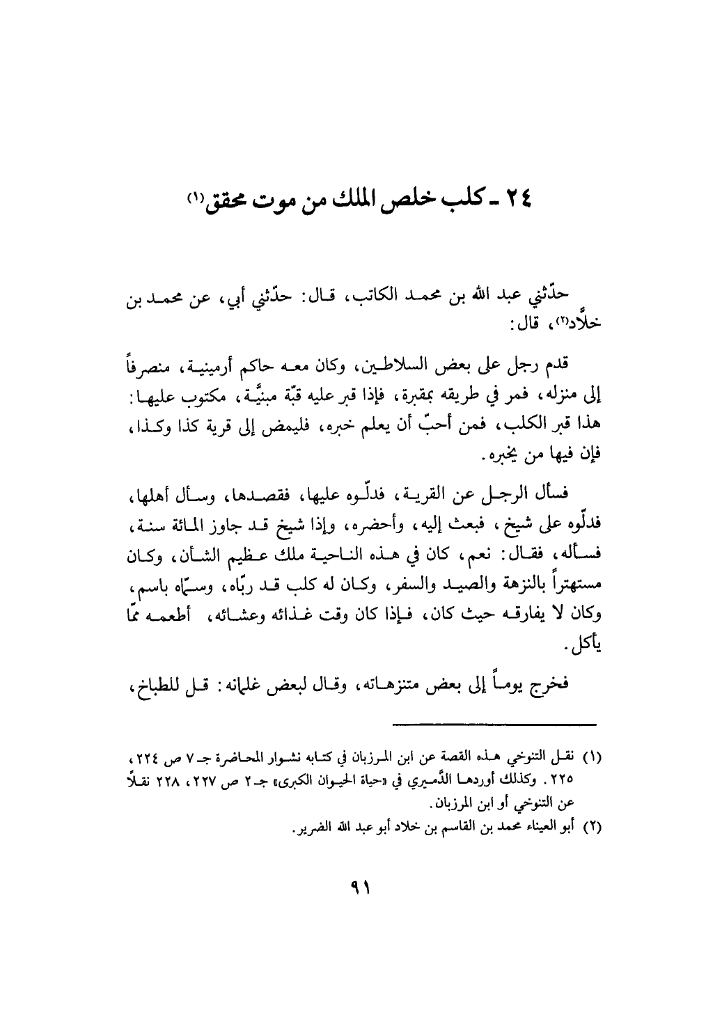 وحدثني عبد الله بن محمد الكاتب قال حدثني أبي عن محمد ابن خلاد قال قدم رجل على بعض السلاطين وكان معه حاكم أرمينية منصرفا إلى منزله فمر في طريقه بمقبرة فإذا قبر عليه قبة مبنية مكتوب عليها هذا قبر الكلب فمن أحب أن يعلم خبره فليمض إلى قرية كذا وكذا فإن فيها من يخبره فسأل الرجل عن القرية فدلوه عليها فقصدها وسأل أهلها فدلوه على شيخ فبعث إليه وأحضره وإذا شيخ قد جاوز المائة سنه فسأله فقال نعم كان في هذه الناحية ملك عظيم الشأن وكان مشهورا بالنزهة والصيد والسفر وكان له كلب قد رباه وسماه باسم وكان لا يفارقه حيث كان فإذا كان وقت غذائه وعشائه أطعمه مما يأكل فخرج يوما إلى بعض منتزهاته وقال لبعض غلمانه قل للطباخ @